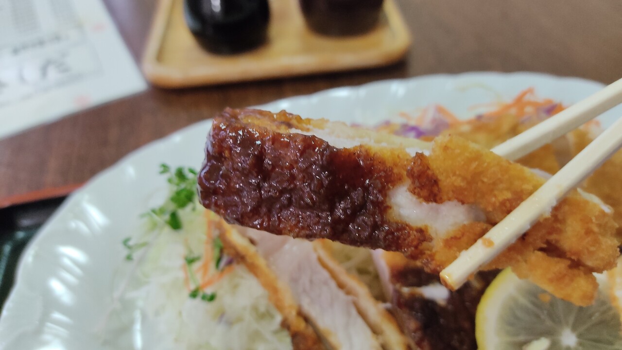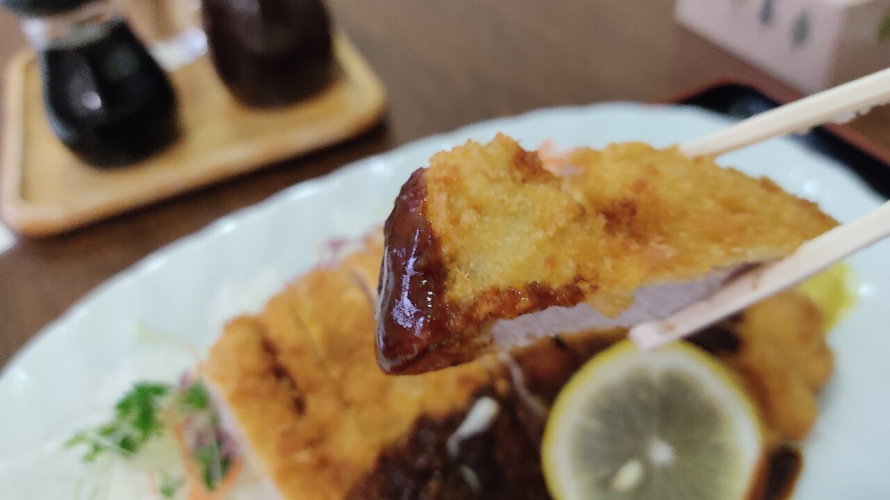 衣は少しハードな硬さのカリカリ具合で 中の豚ロース肉は霜の降った脂っこい肉質ではなく程よく歯応えのある肉質で肉を食べてる感があり 食べ応えかまあります。