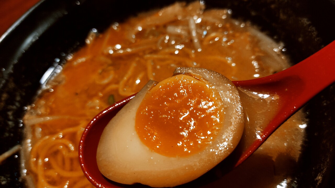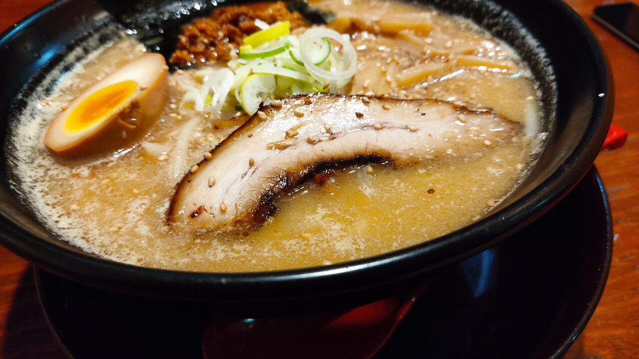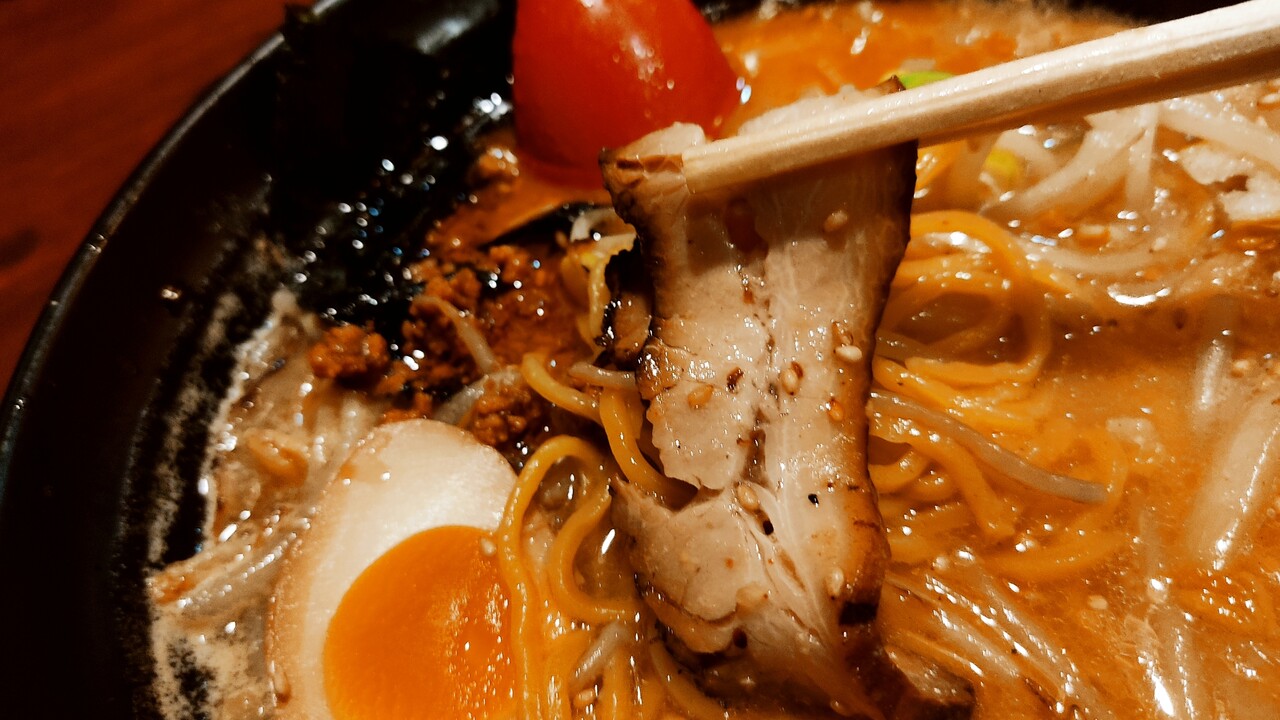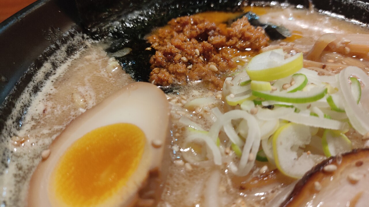 熱々のスープに味玉、チャーシュー、長ネギ、海苔、肉味噌、メンマが入っております。
