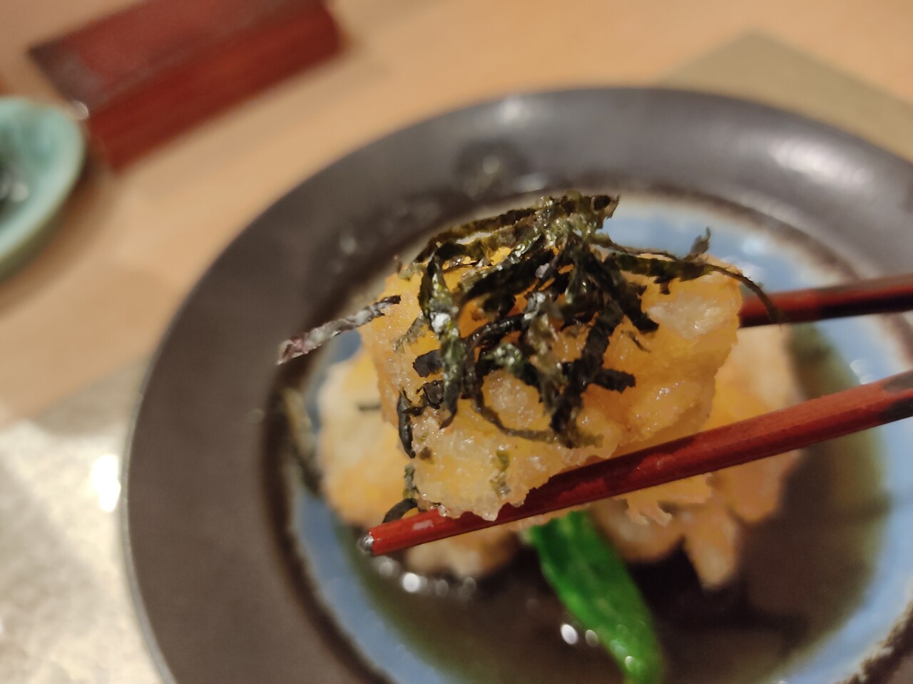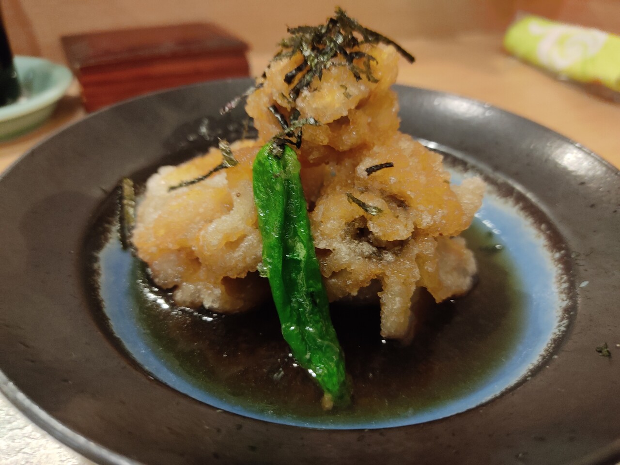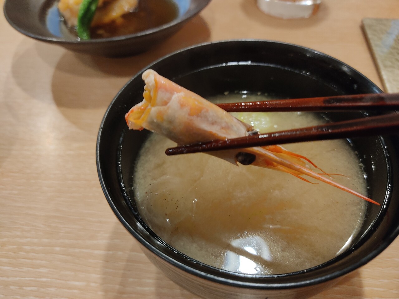そこには海老の頭が入っておりお出汁がよく出ており 染みる美味しさです。飲んでいると少しピリッとする風味がありましてお聞きしたところ山椒が入っているとの事で面白いアクセントで自分の家でも試してみたいなぁと思いました。