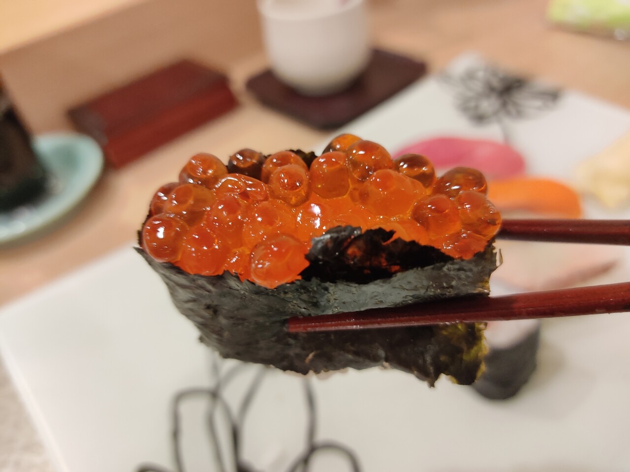 イクラの軍艦… イクラがまるで宝石の如く朱に煌めいていますが頂きますと はい美味い優勝です