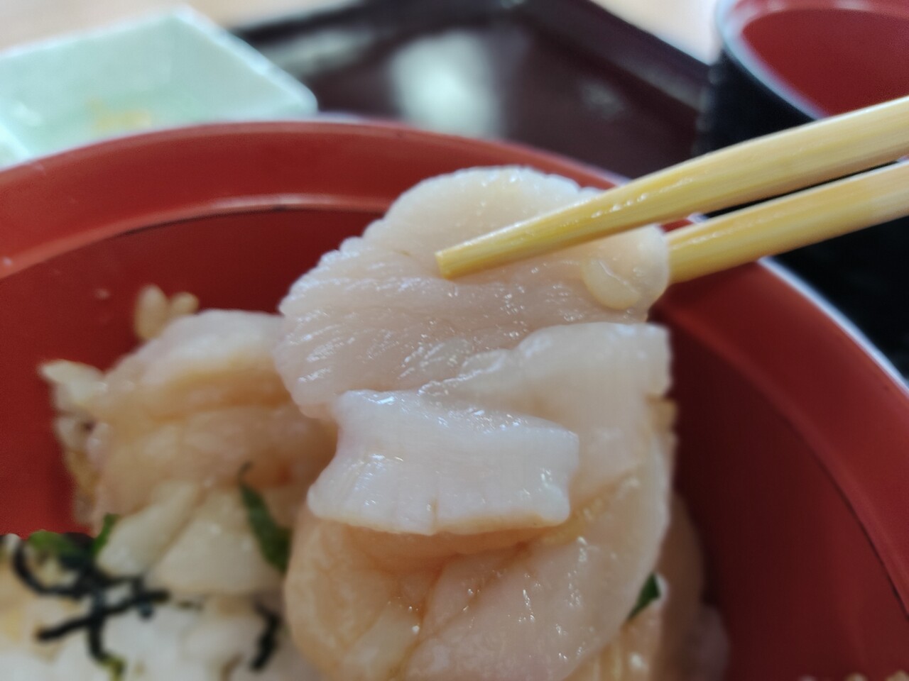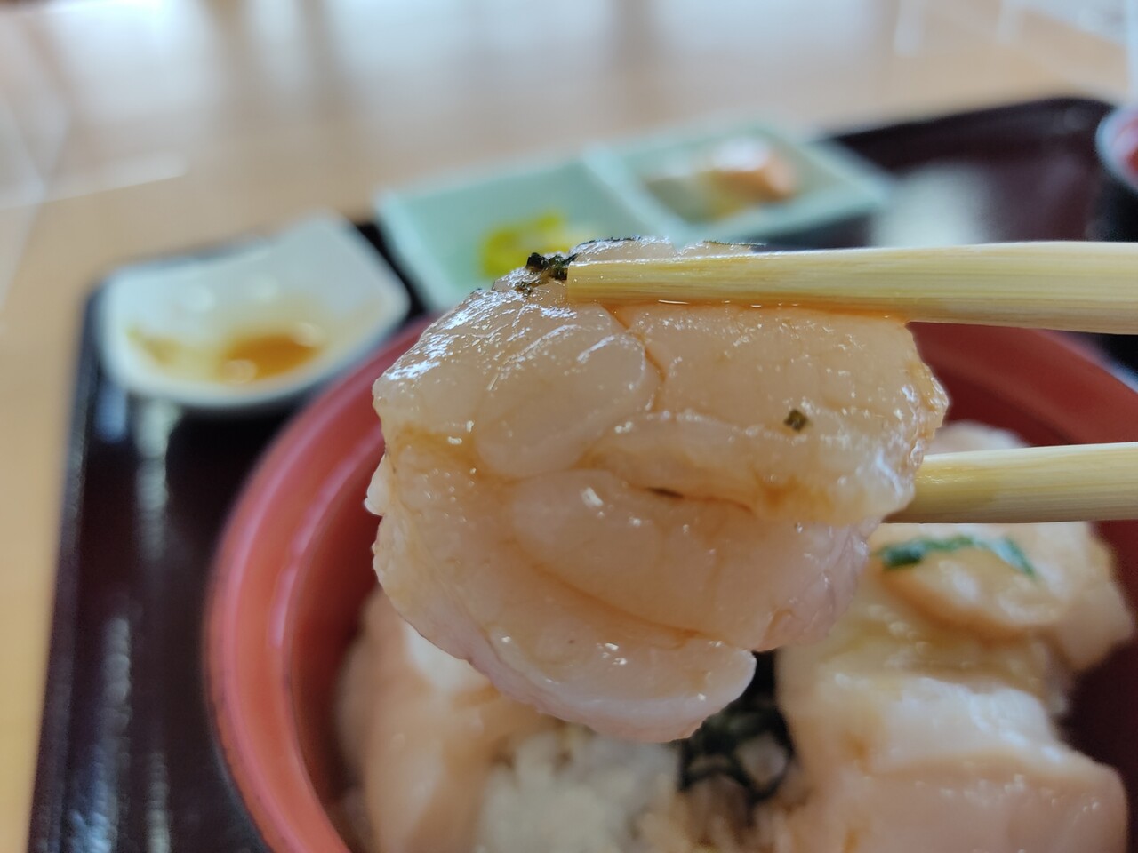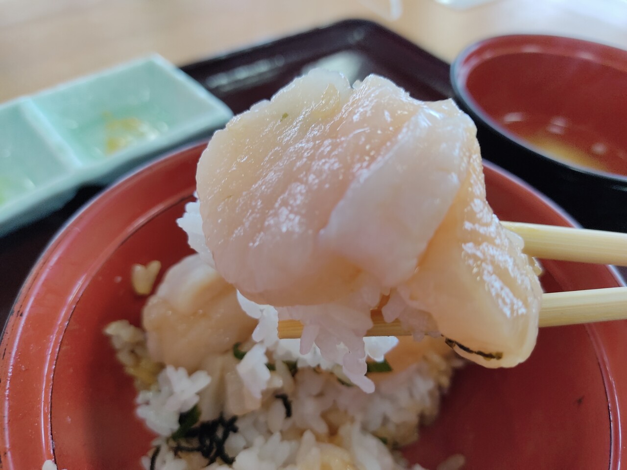 輝くホタテの貝柱がご飯の上に乗っております。