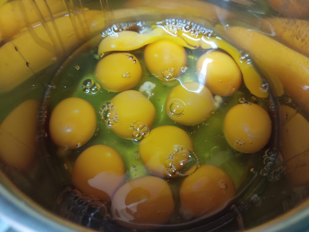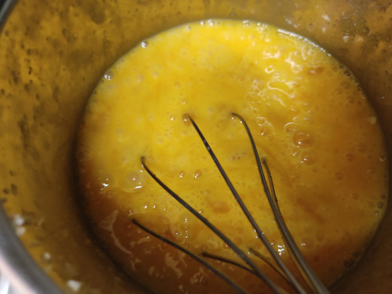 その牛乳を少しづつ 卵に投入し泡立たないように混ぜ込みプリン液の完成です。