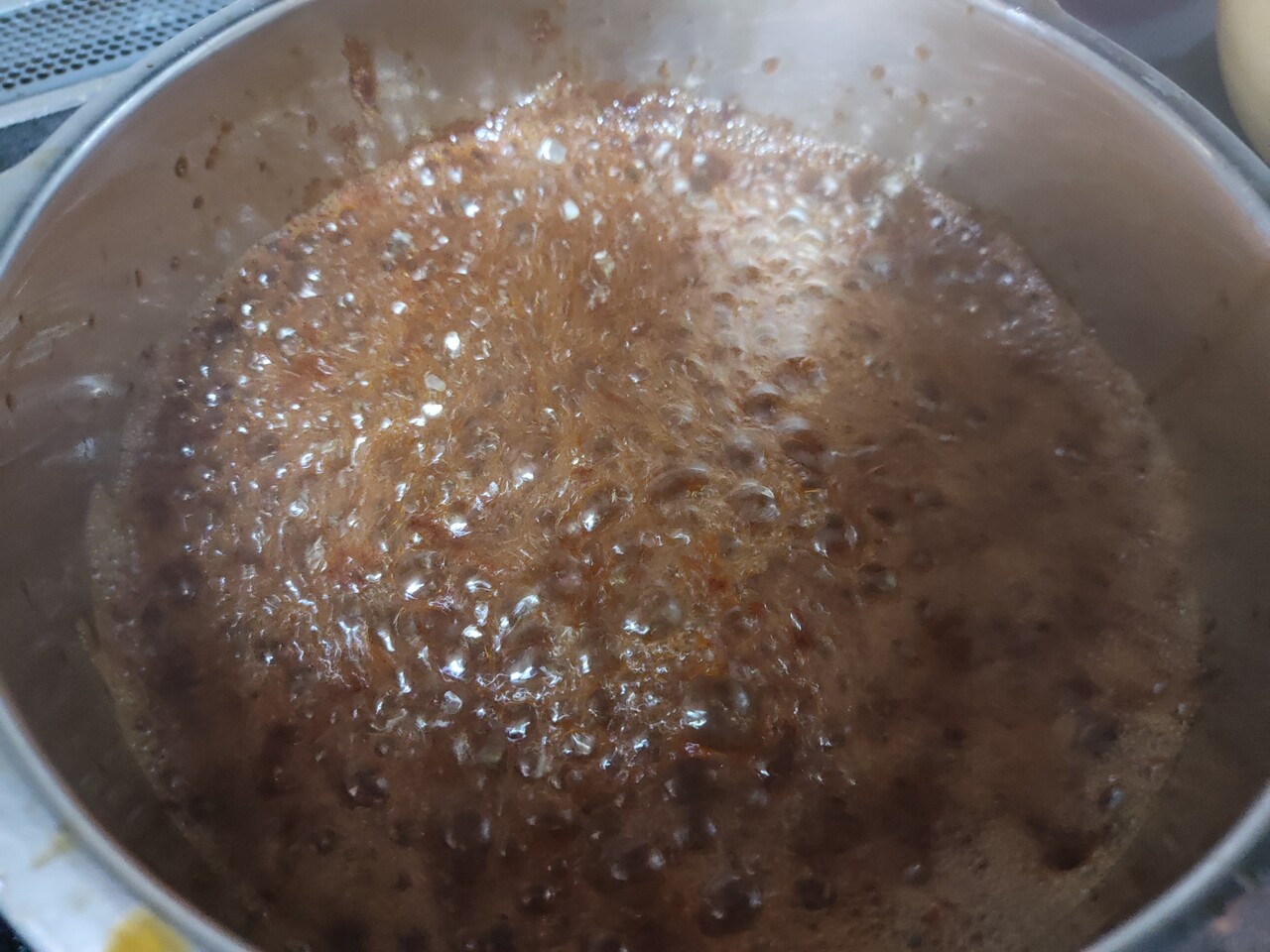 砂糖が溶け出して茶色くなりましたら 100mlのお湯をぶち込みます。その際カラメルは飛び散り、湯気がかなり立ち上がりますので火傷に注意です。