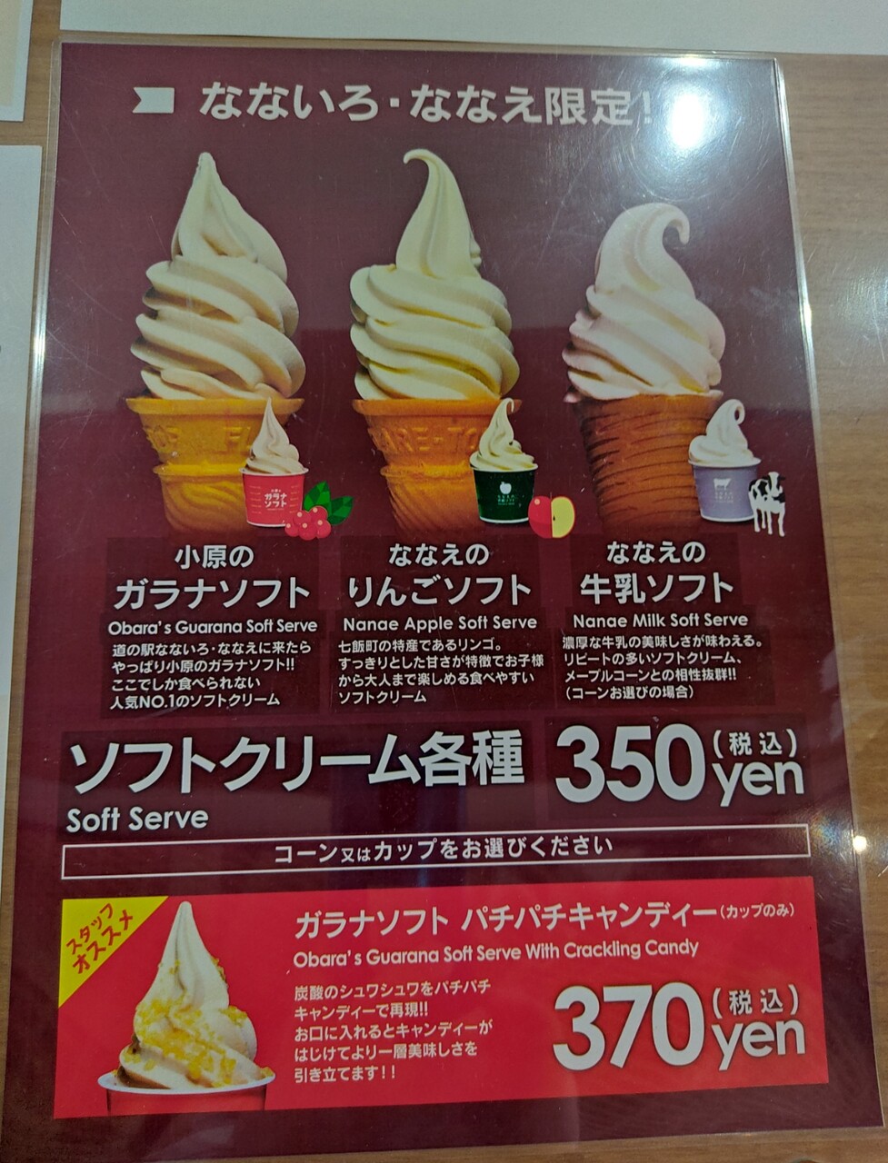ソフトクリームは3種類ありますが、ななえの牛乳ソフト(350円税込)をコーンでオーダーする事にしました。