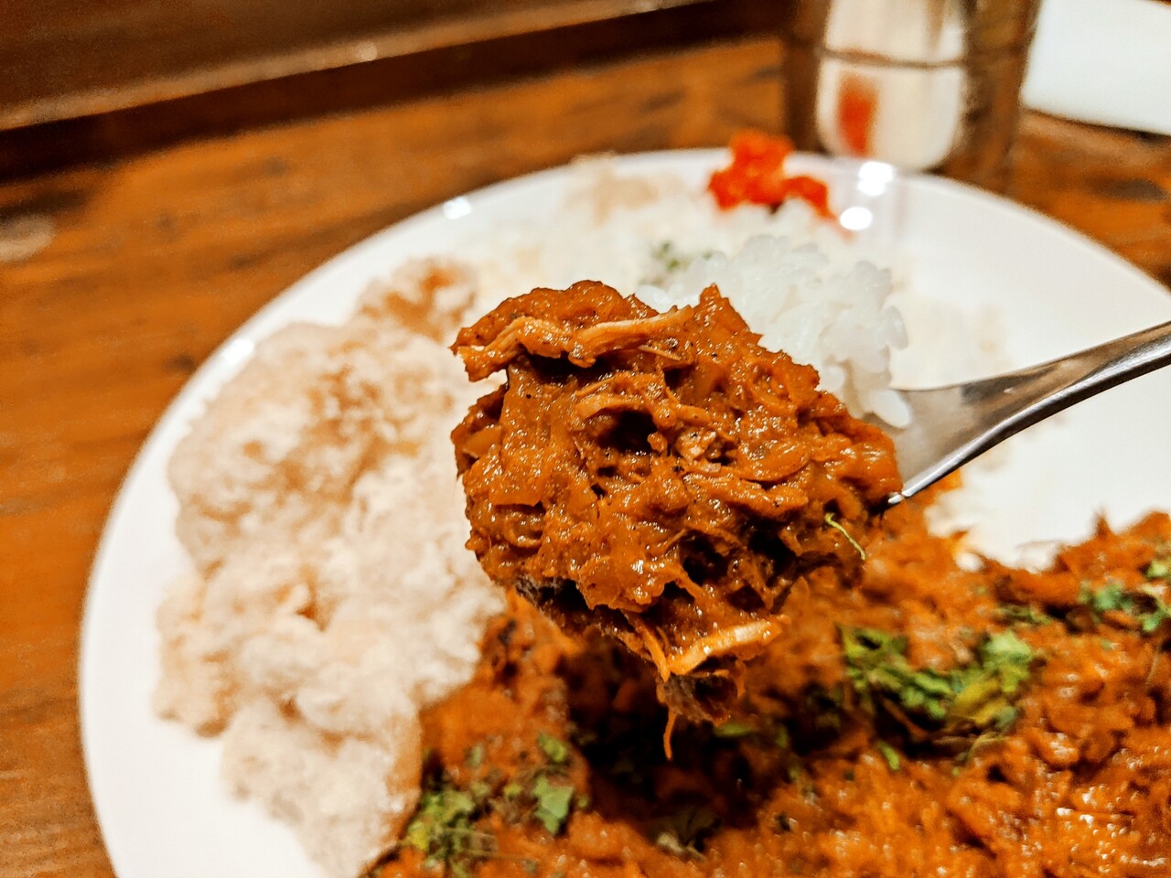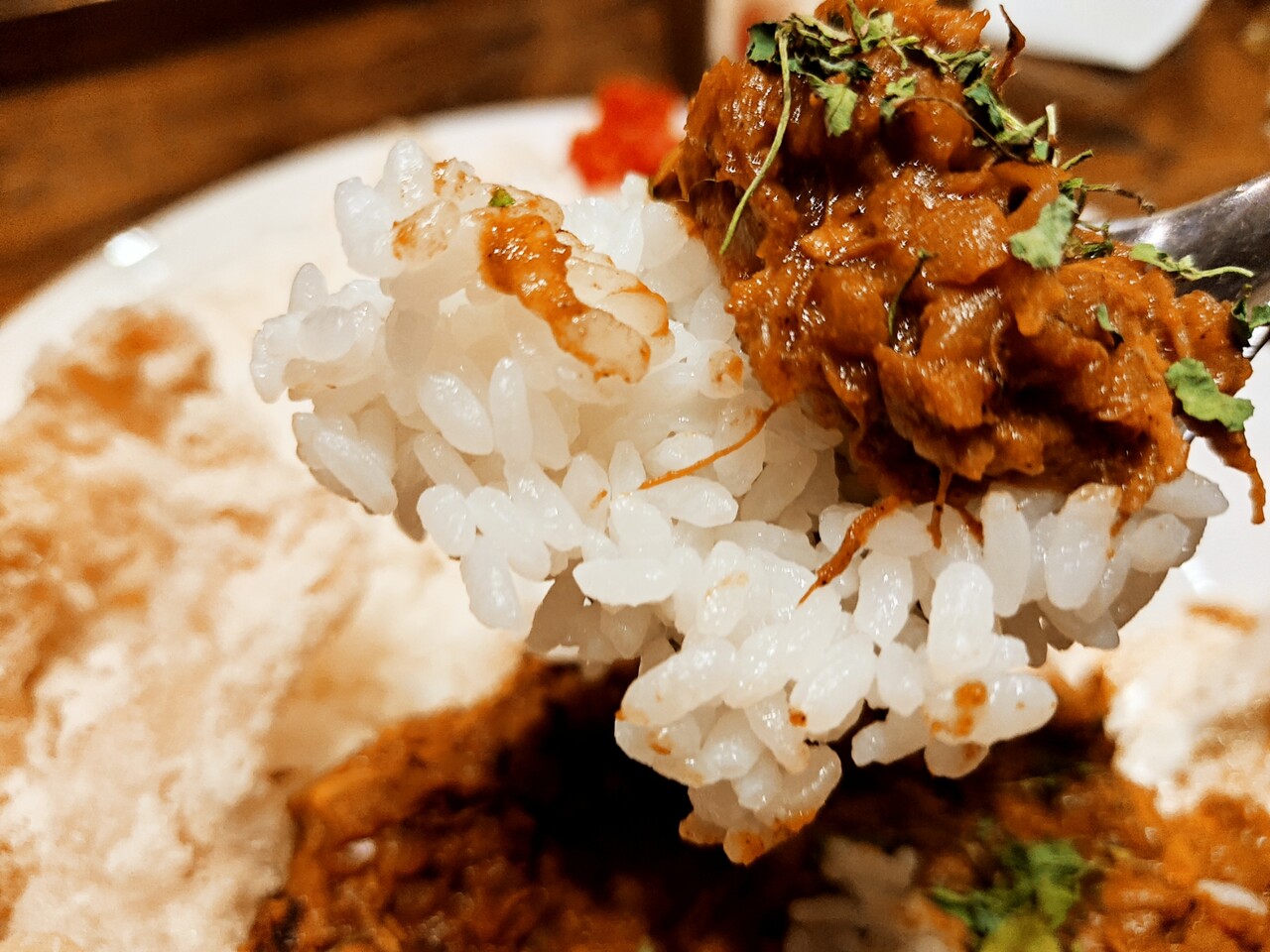 カレーをスプーンで掬うとカレーに対しての鶏肉の割合が結構多いです。頂くと 少し甘めのチキンカレーで後からスパイシーな辛さがやってきますが 程よく美味しく頂けます。