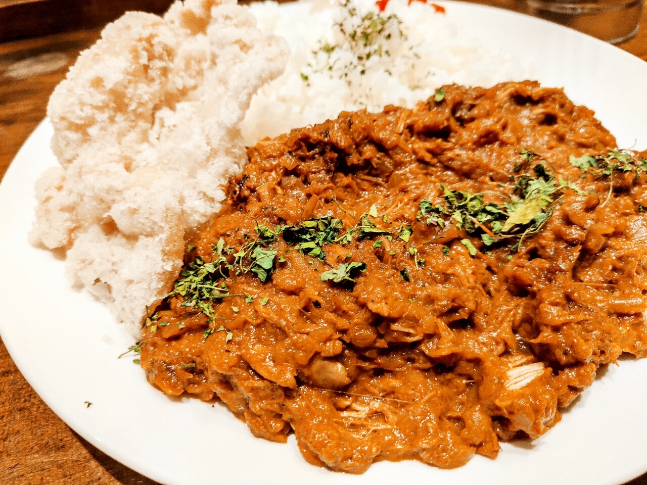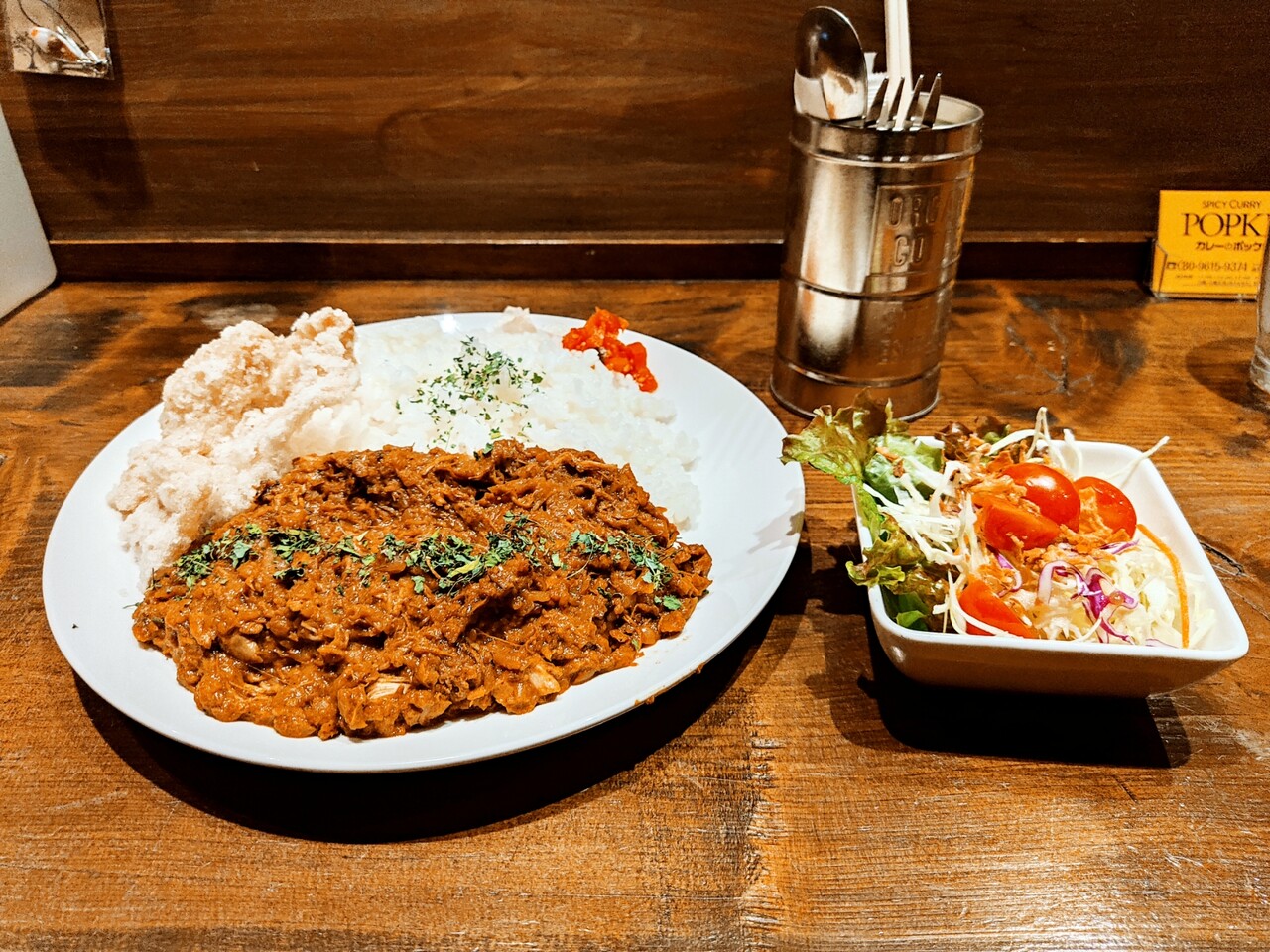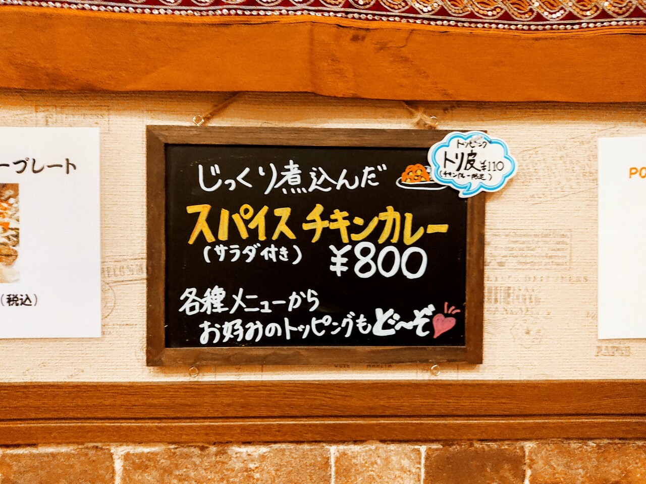 今回何食べようかなと思うと こちらをオススメされて→ スパイスチキンカレー(800円税込)+大盛り(220円税込)+鶏皮(110円税込)のトッピングをオーダー致しました。