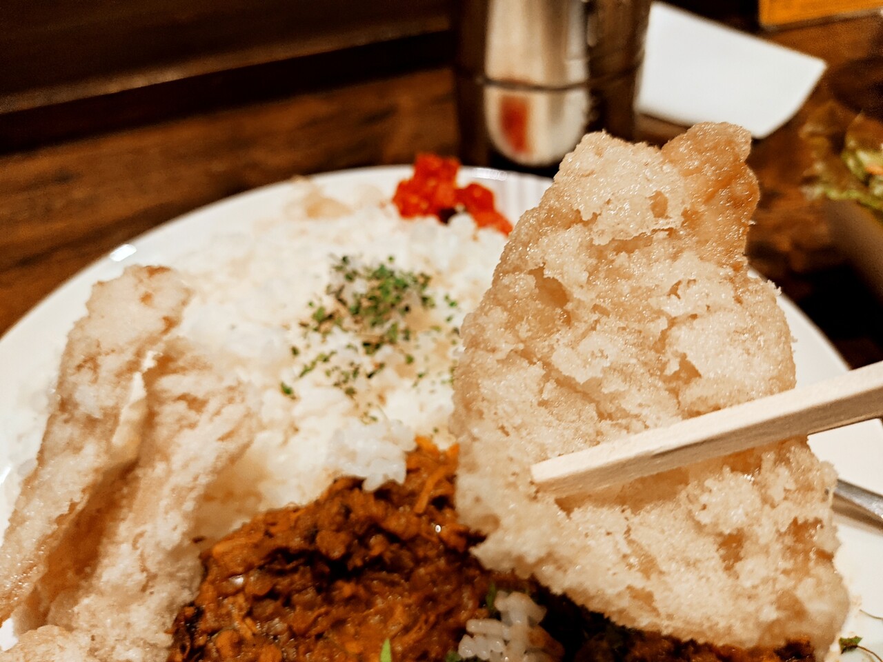鶏皮にカレーを乗せて頂くと 鶏皮のサクサクっとした食感と 噛むと脂がジュワっと溢れ出てそこにチキンカレーが合わさると 美味しいんですよね。