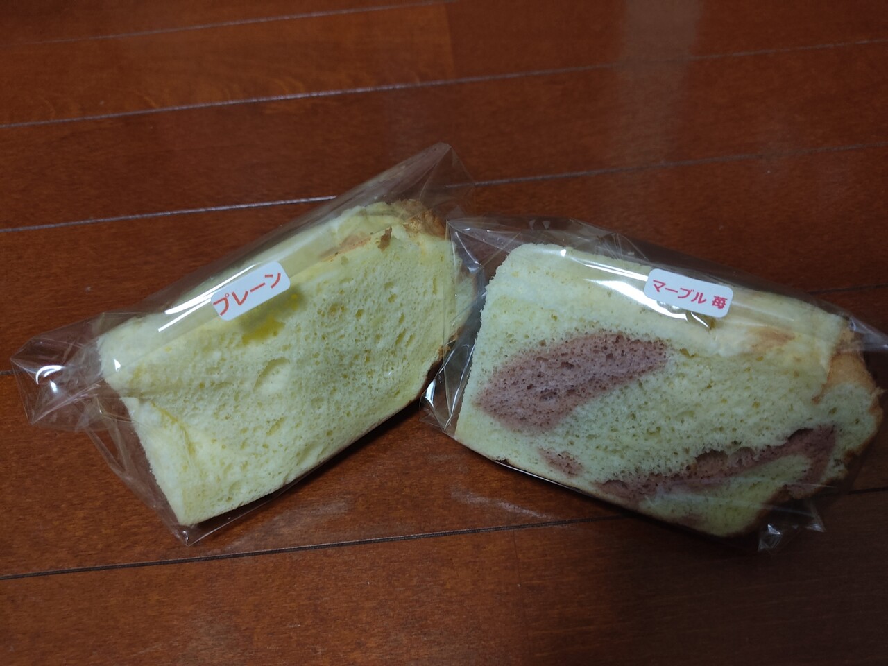 プレーンのシフォンケーキはフワッフワで卵の風味もよく ばり美味い! マーブル苺はイチゴの風味もありこちらも美味い。