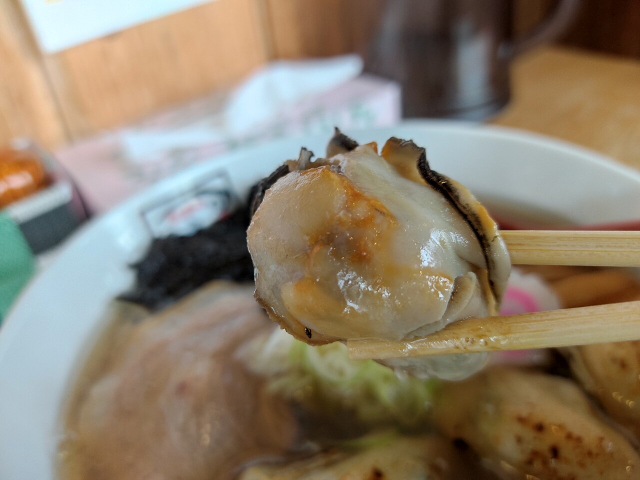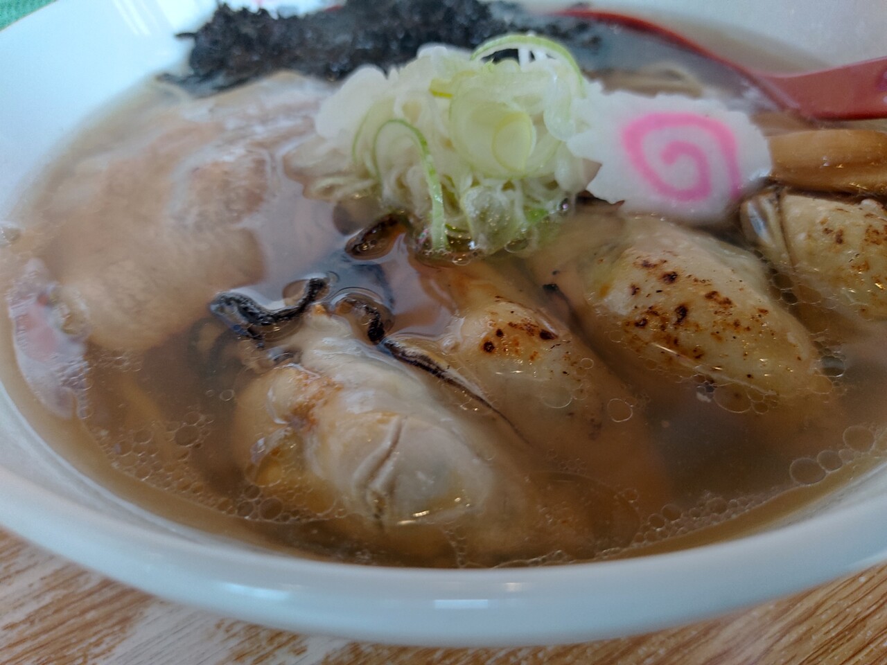 ぷるんとした牡蠣が4つスープに浮いております。他チャーシュー、メンマ、ばら海苔、ナルト、長ネギの内容となります。