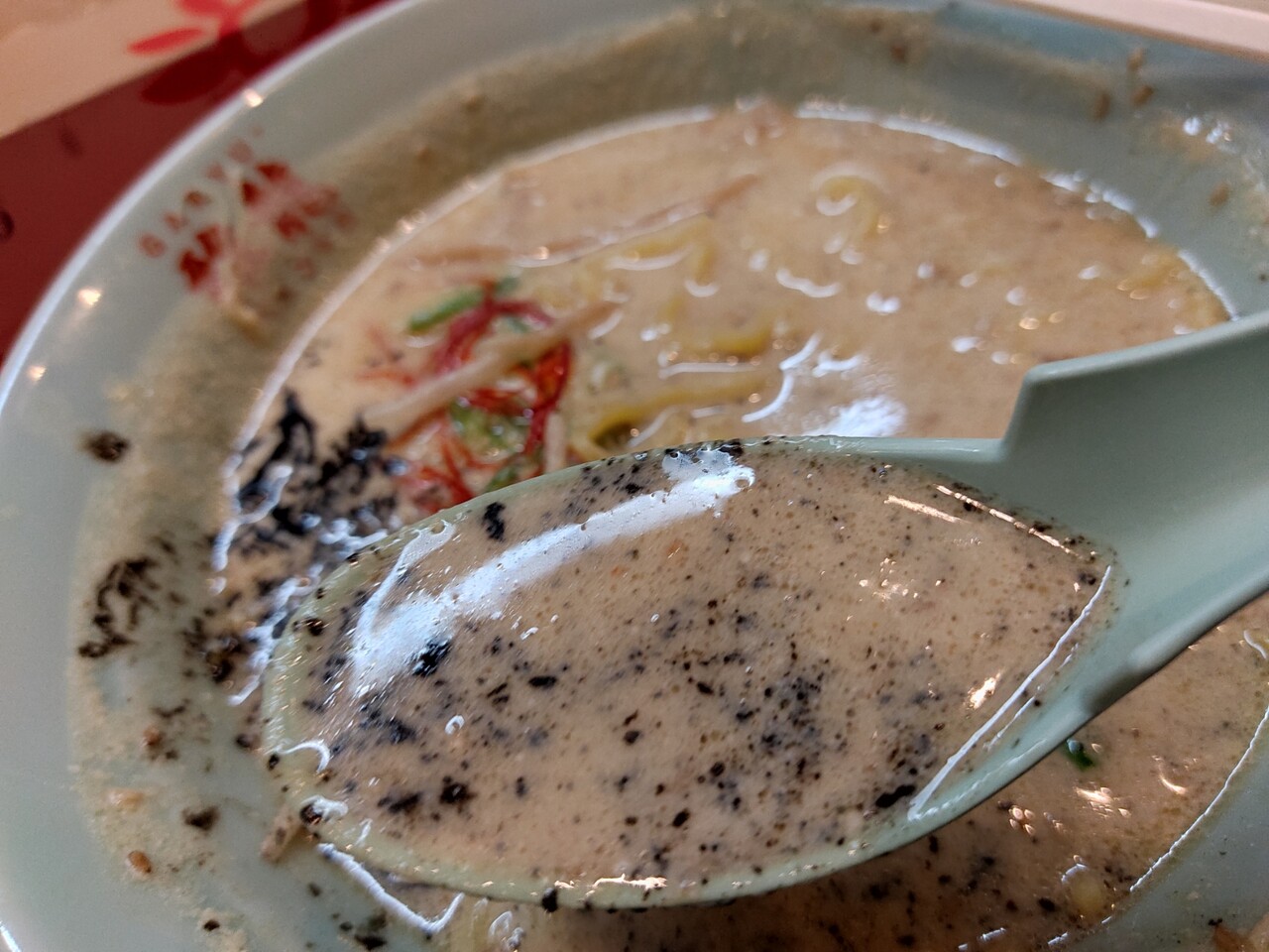 スープも頂いていきますが 味噌ベースなんですが 胡麻の香り風味が半端なく美味い!そしてピリッと辛いのでスープが捗ってしまうんです。