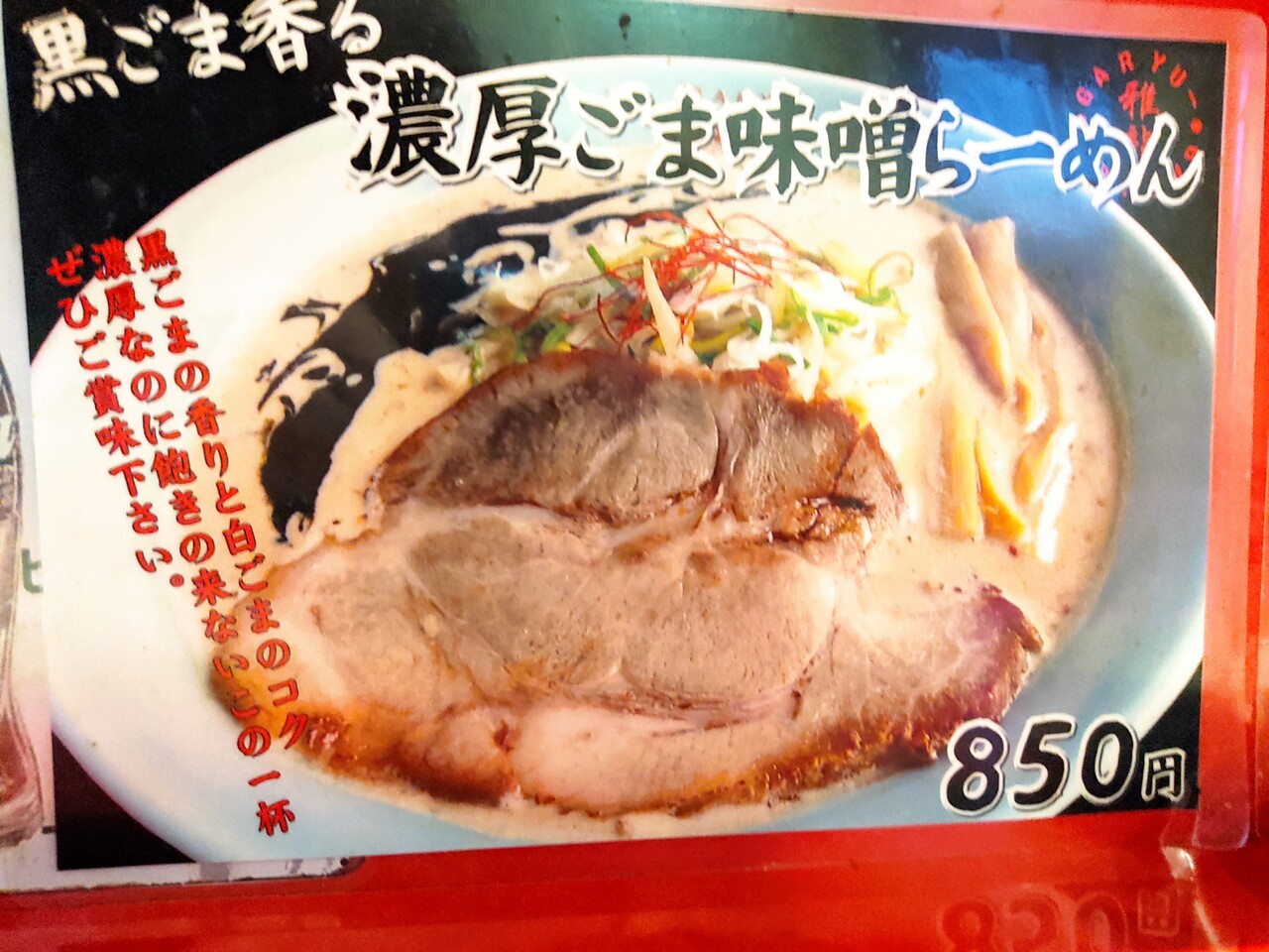 今回はPOPが気になった濃厚ごま味噌ラーメン(850円税込)と半チャーハン(350円税込)をオーダーして見たいと思います