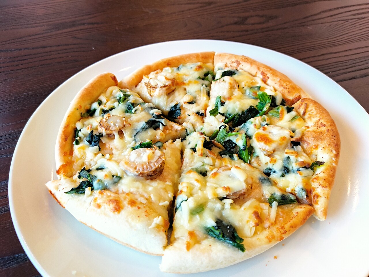 ピザには切れ込みが入っており 一つ一つに稚貝が乗っております(内容は 帆立稚貝、タラコ、ほうれん草、チーズ)