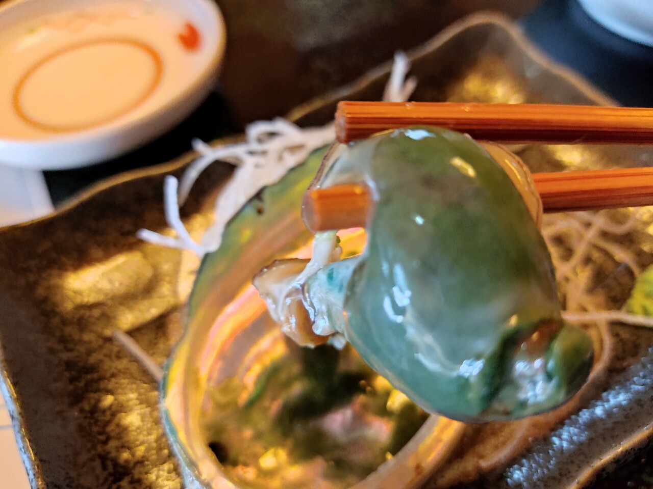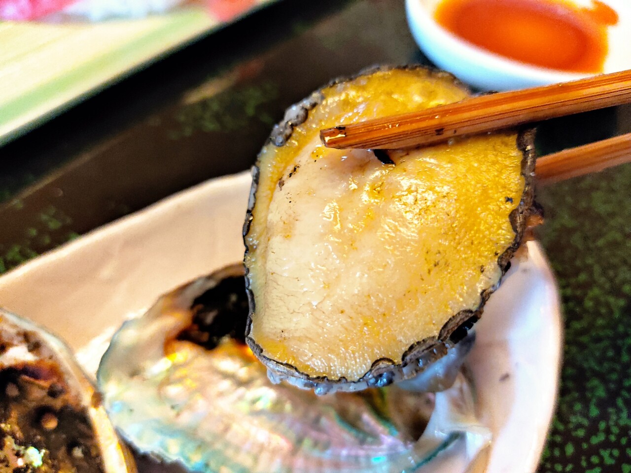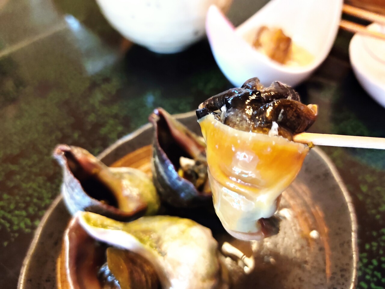 大きめの鮑が2個 そのうち一つをキャッチして口に運びます…