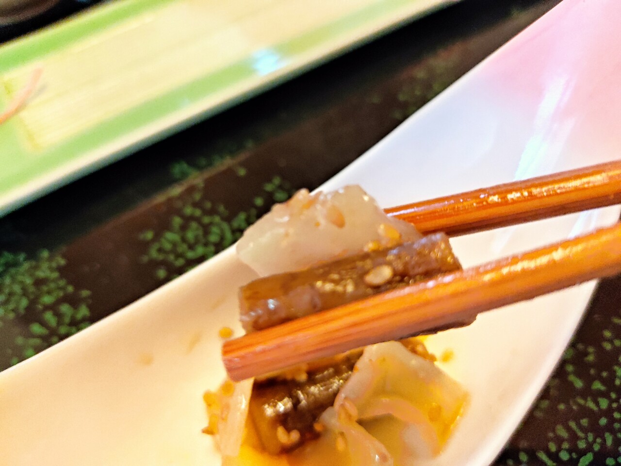 からの 口休めに甘辛い牛蒡とクラゲの和物を挟みましてからの
