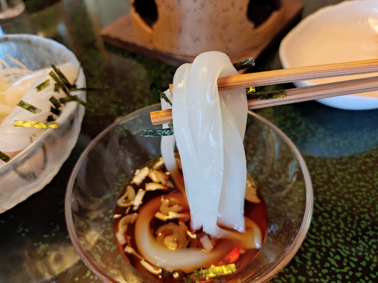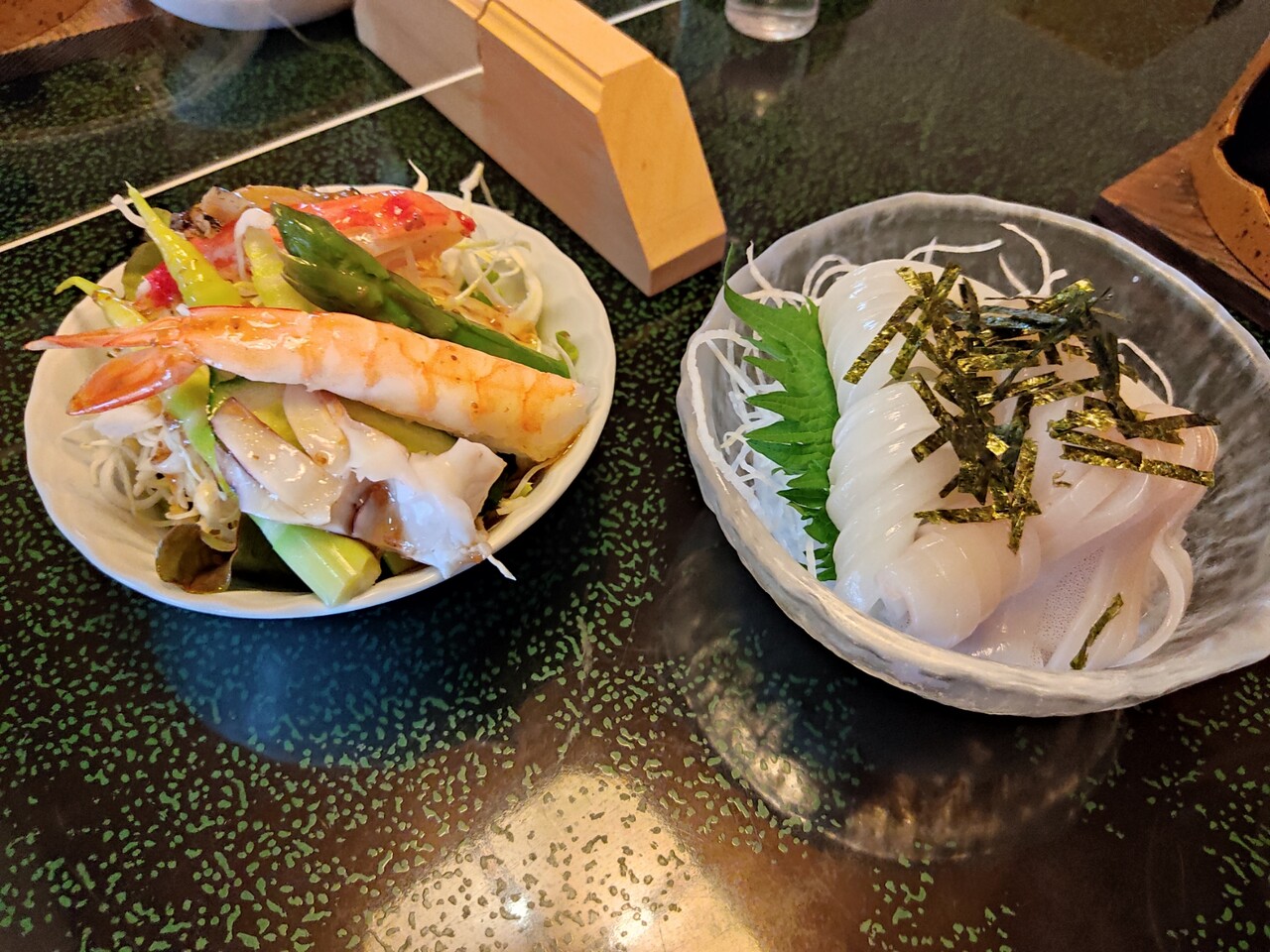 そうしていると いかソーメンと海鮮サラダが運ばれてきました