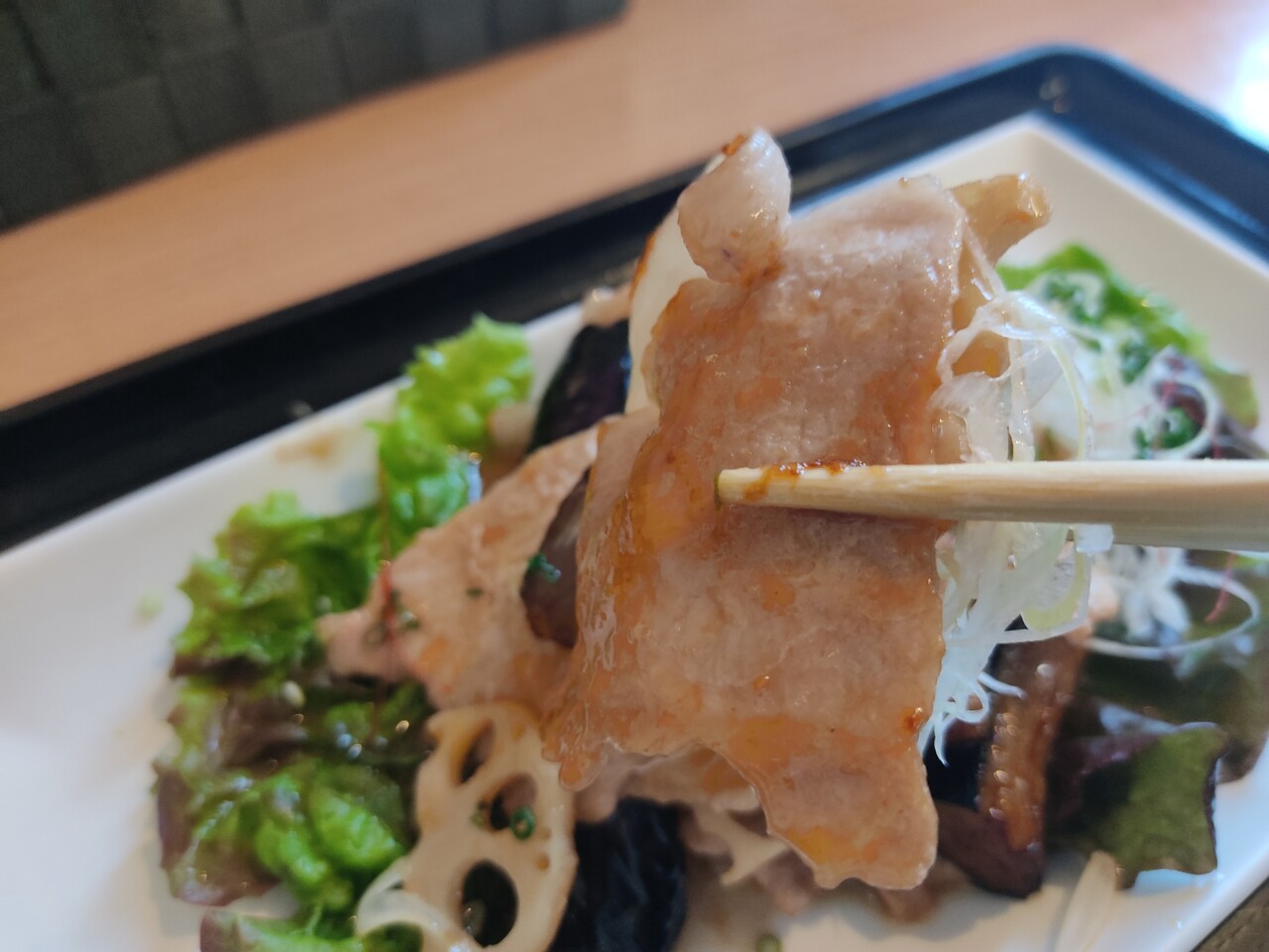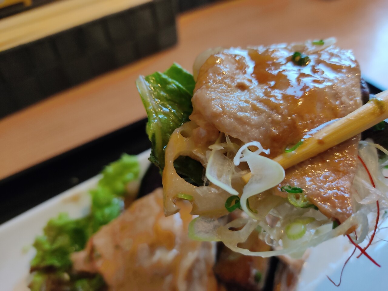 また味噌炒めに戻り 豚ロース肉とキャベツ、レタス、蓮根、糸唐辛子をまとめて口に運びます…