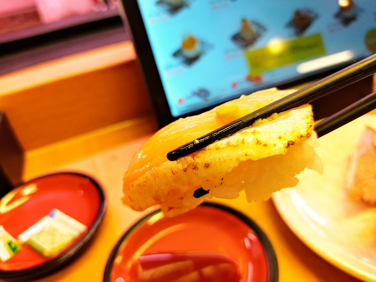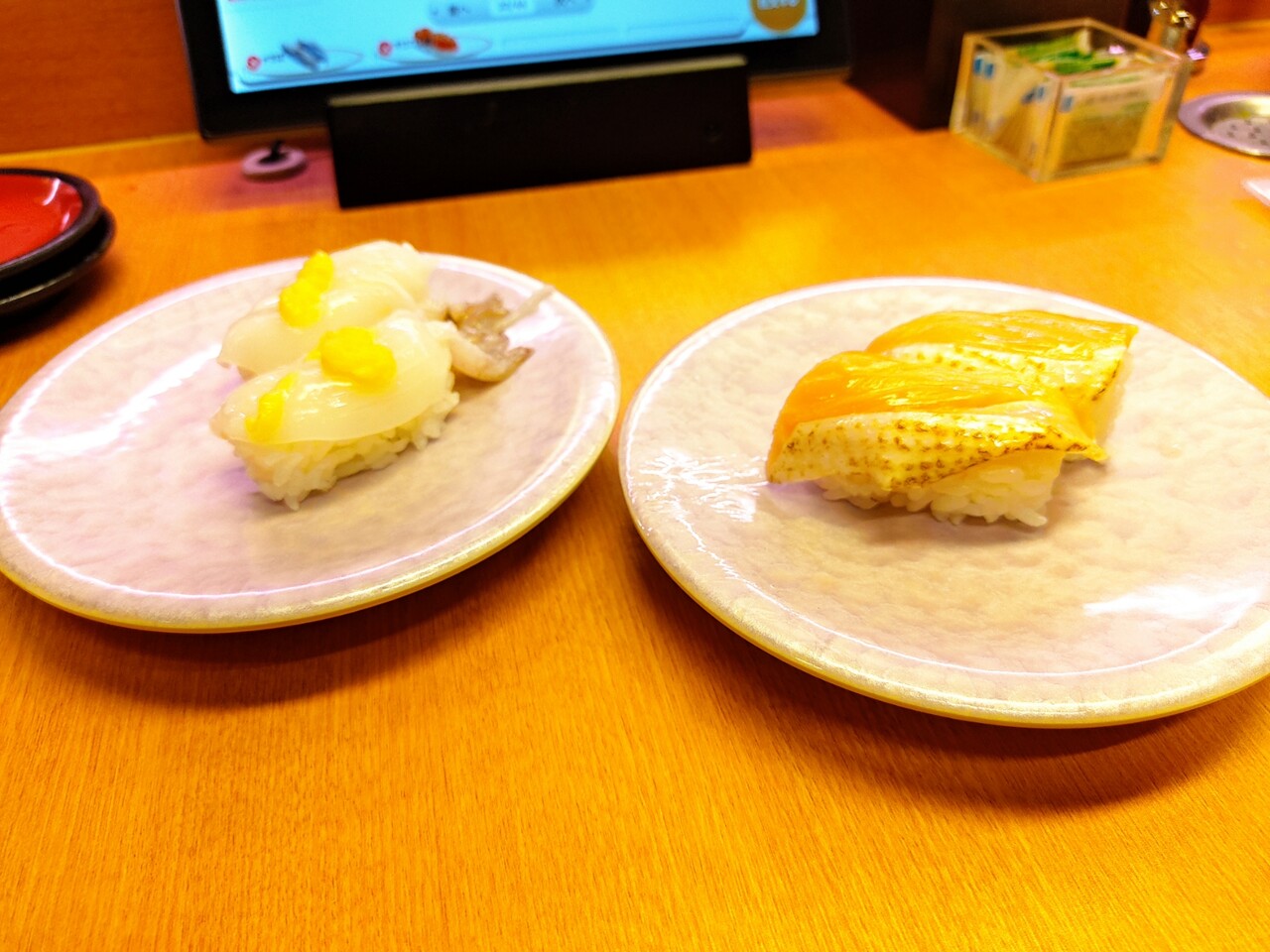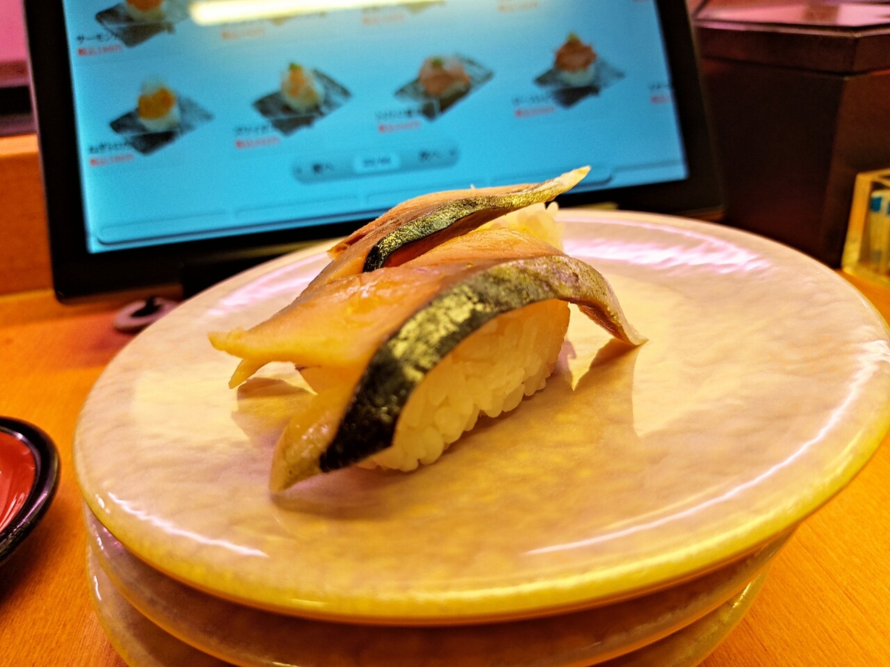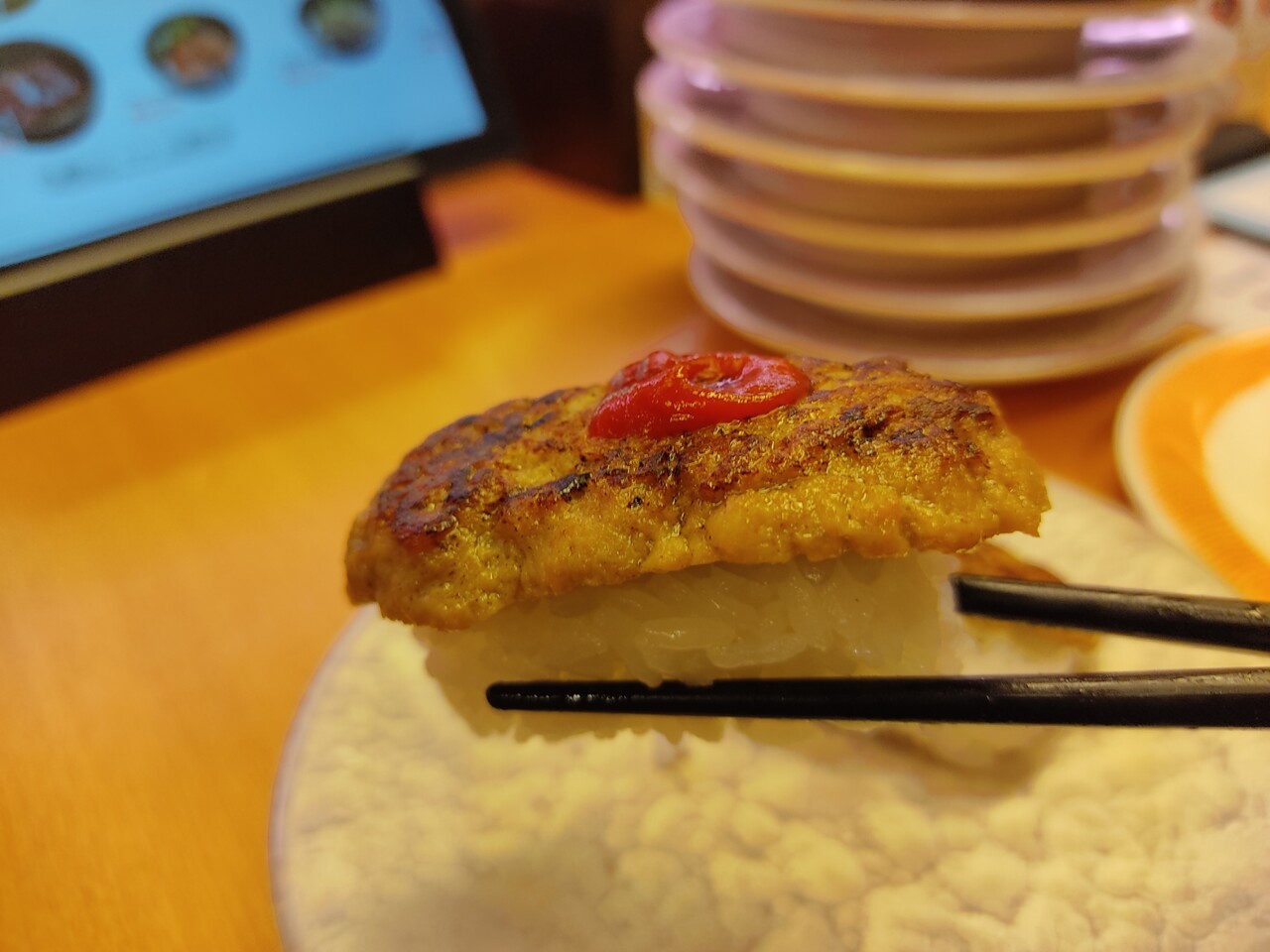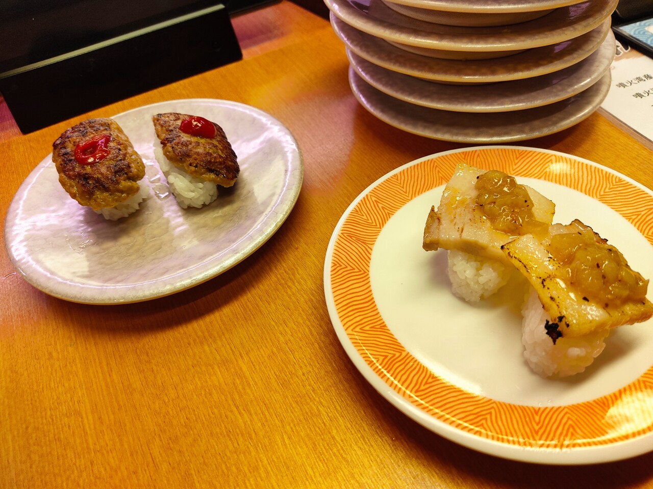ハンバーグと豚カルビのお寿司。回転寿司でしか食べられないやつですね笑