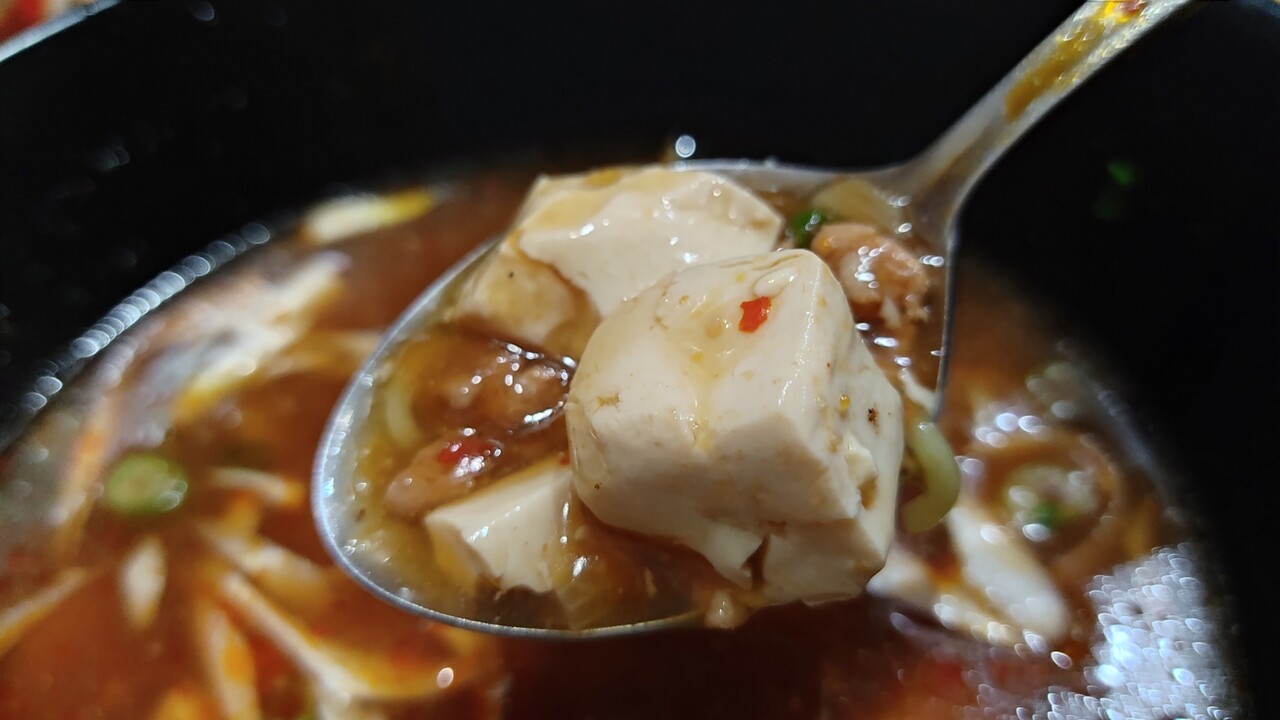 先ずは麻婆餡をスプーンで掬い口に運びます…
