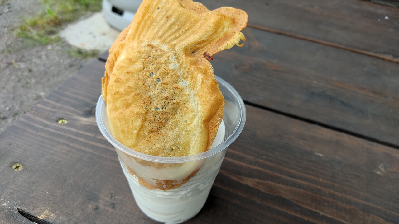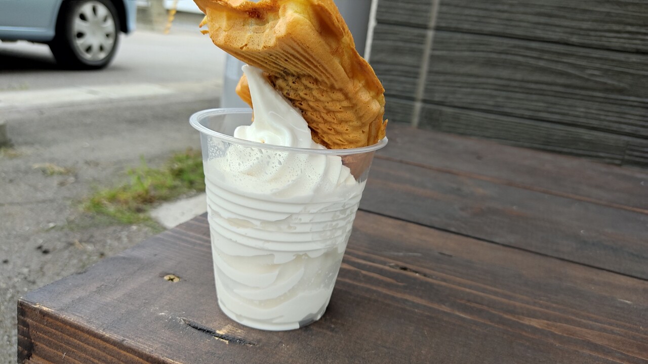 カップに巻かれたソフトクリームの上に徐にたい焼きが刺さっております。
