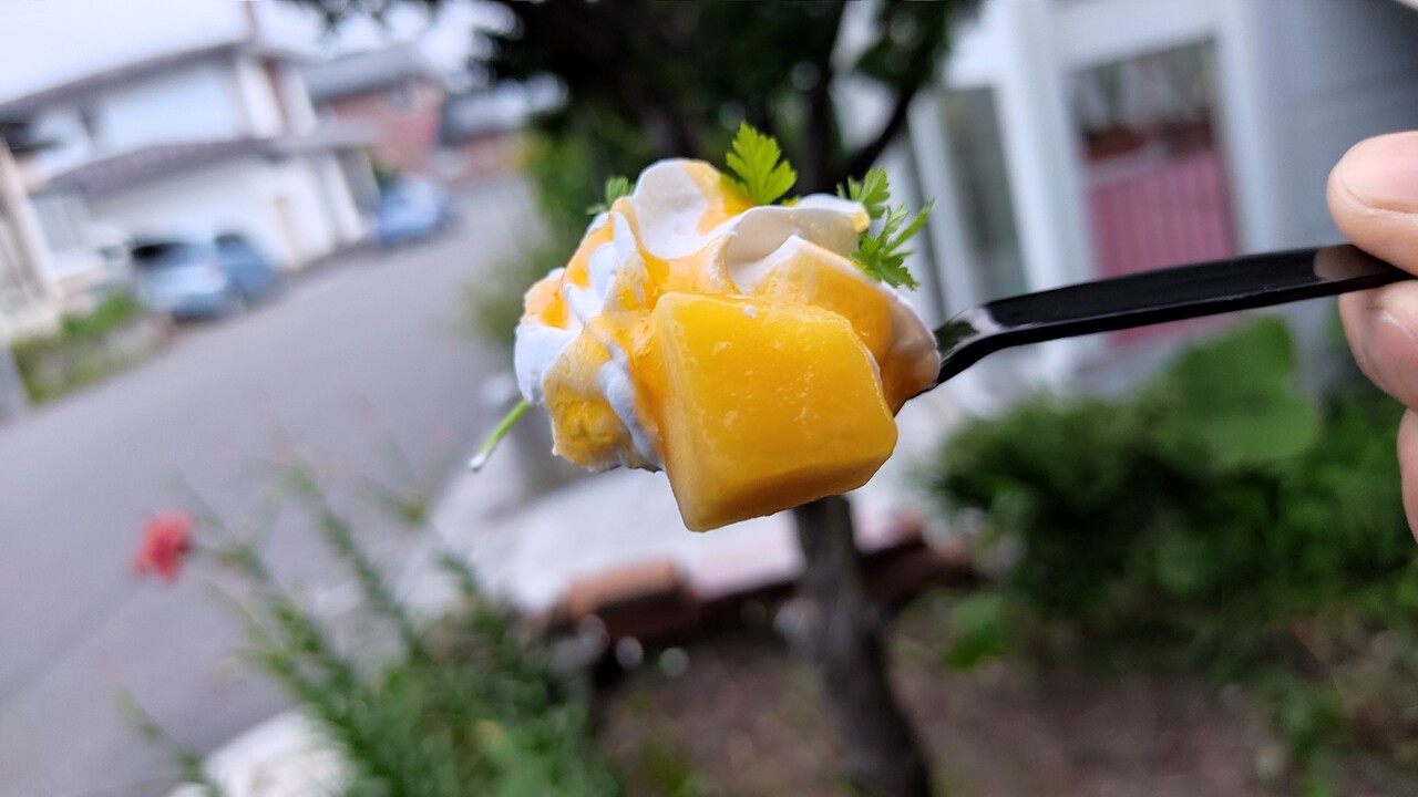 そしてフローズンマンゴーとホイップクリームをスプーンで掬い 口に運びます…