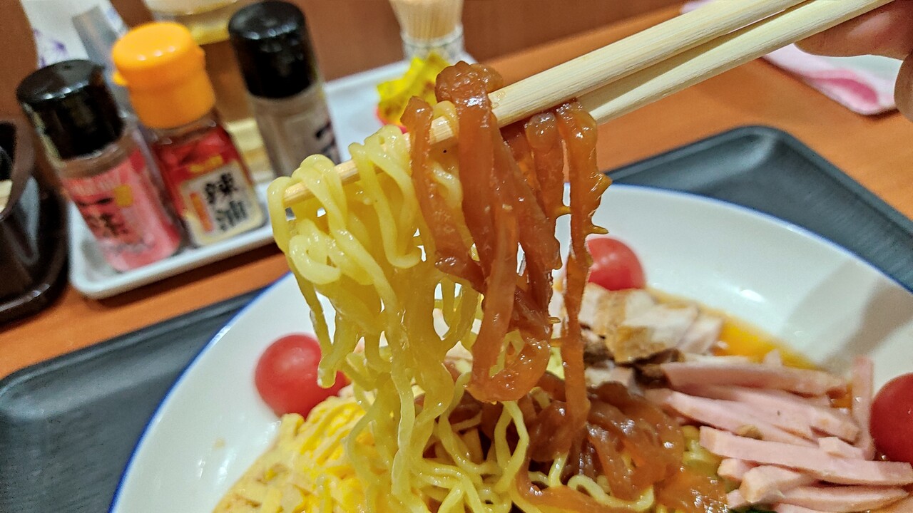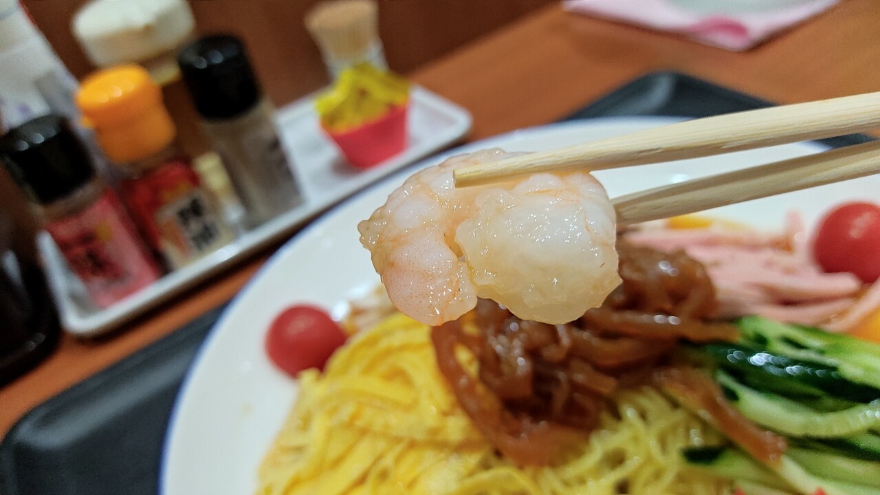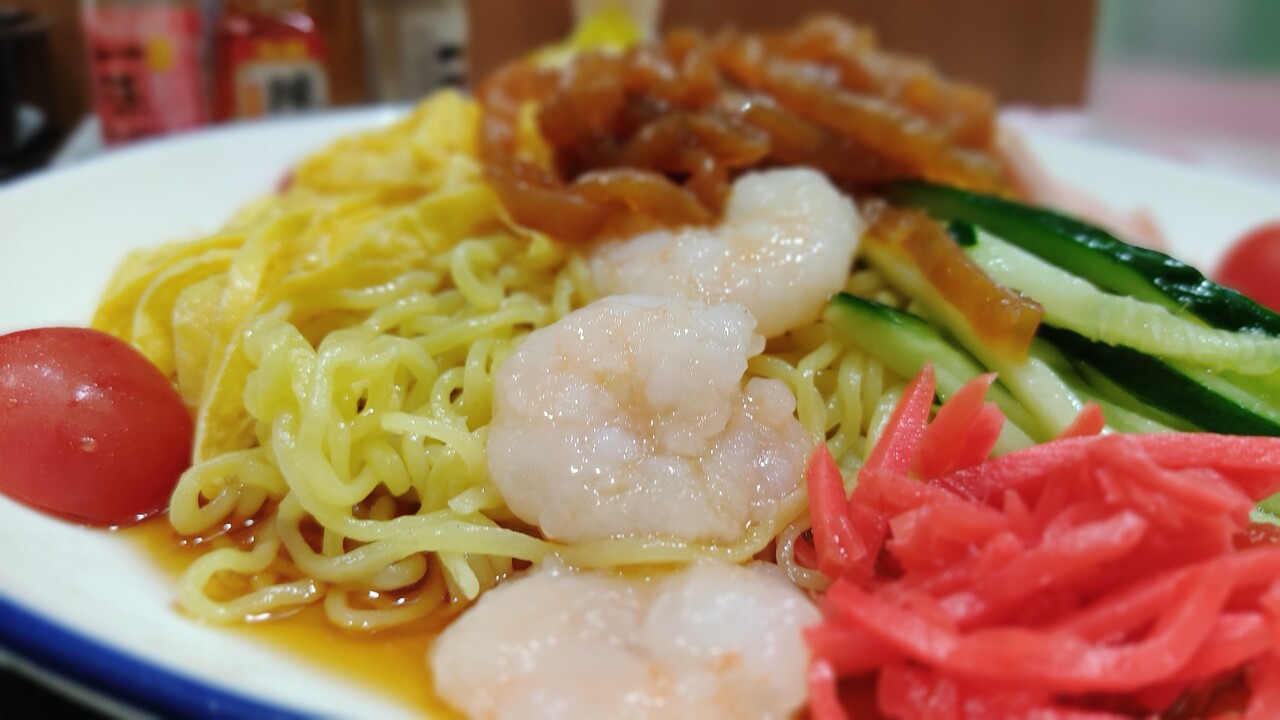 内容はミニトマトらエビ、クラゲ、きゅうり、錦糸卵、ハム、鶏ささみ、焼豚、紅生姜となり具沢山ですね。