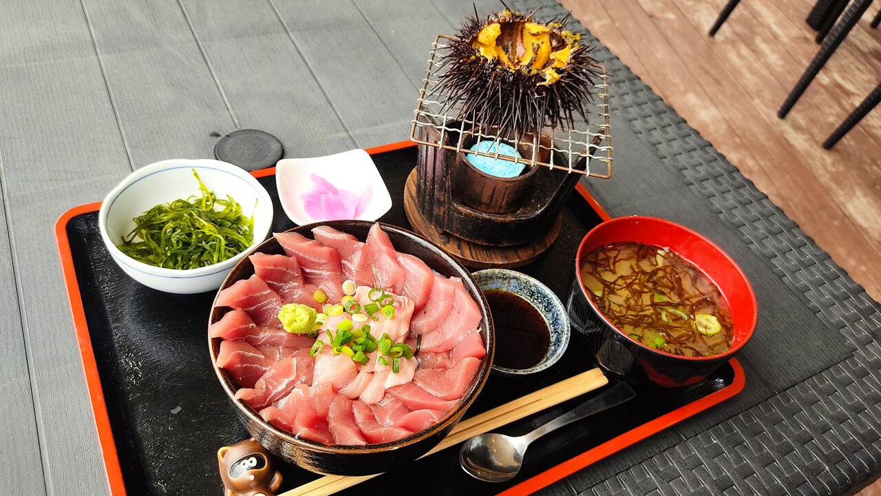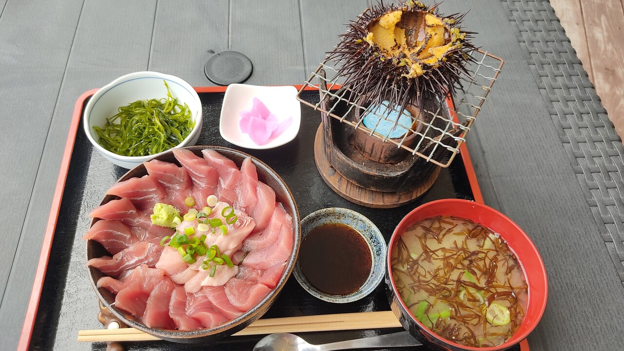 今回は 矢越岬沖産 生本マグロ丼(2,300円税込)と 朝採れ うに丸焼き(1,000円税込)をオーダーしまして