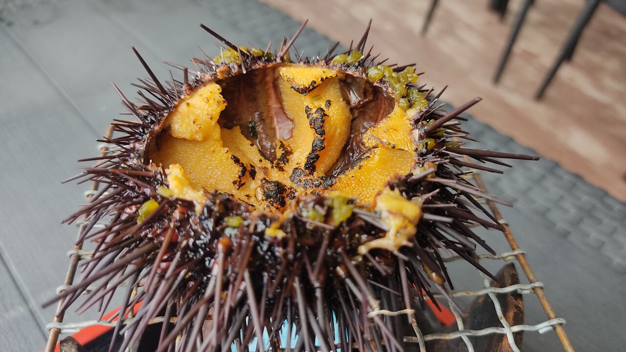 朝穫れの焼きウニは 表面バーナーで炙られ焦げ目が多少入った状態で焼かれて提供されます
