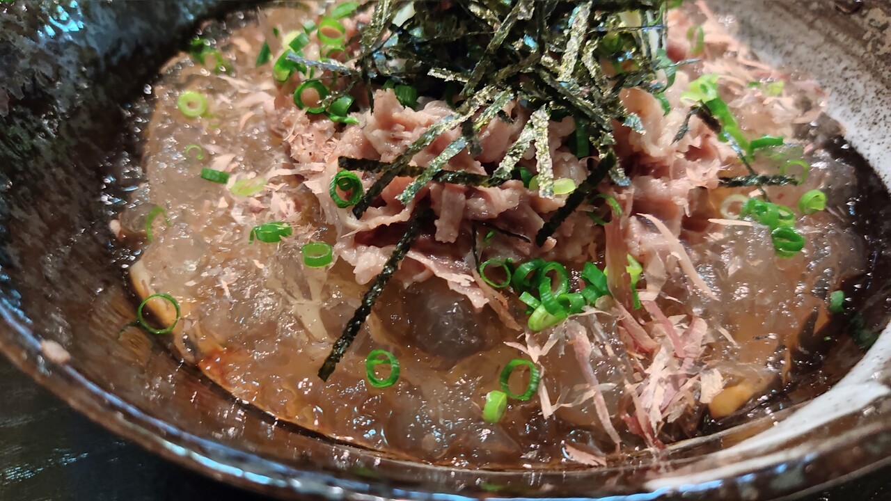 極UMAMI美人のジュレの上に牛バラ肉が上に乗っていて 海苔、長ネギが塗されおります