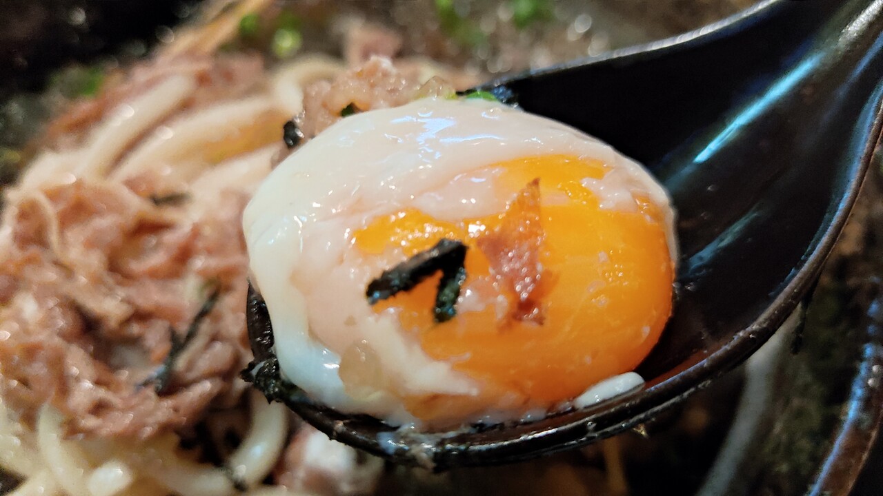 温泉卵も乗っておりますので卵を割り 卵黄をとろりと流し
