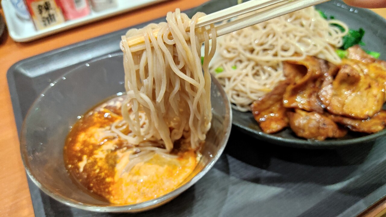 坦々つけタレに蕎麦を絡めて絡めて頂きます…