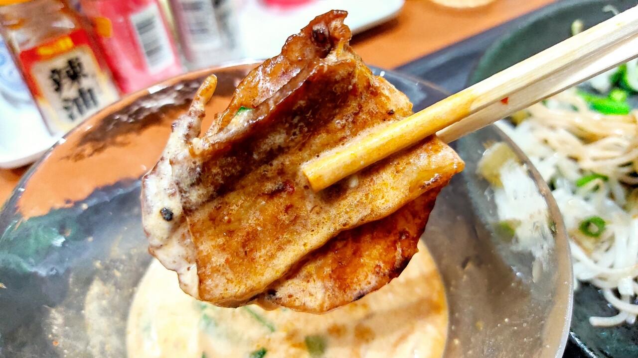 モヤシの食感、ニラの香りと甘み、そしてつけタレの坦々風味と辛味 全てマッチングして美味しいんです