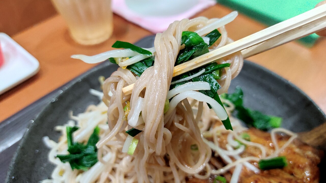 今度はニラとモヤシを蕎麦といっしょにキャッチして