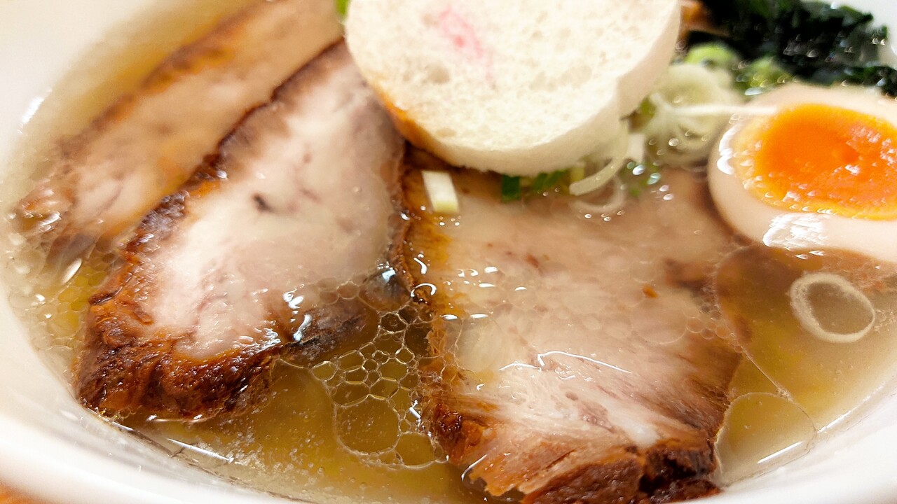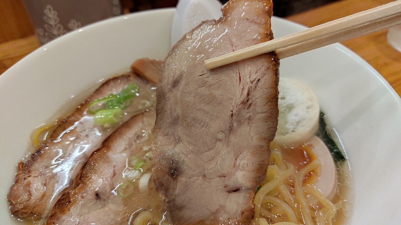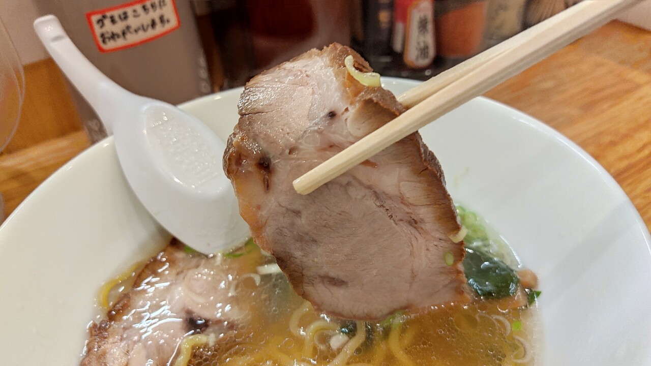からの チャーシューですが大きめなチャーシューで食べると歯応えがあり ボリュームを感じます。そしてあっさりしたスープとの相性も良く美味しく頂けます。