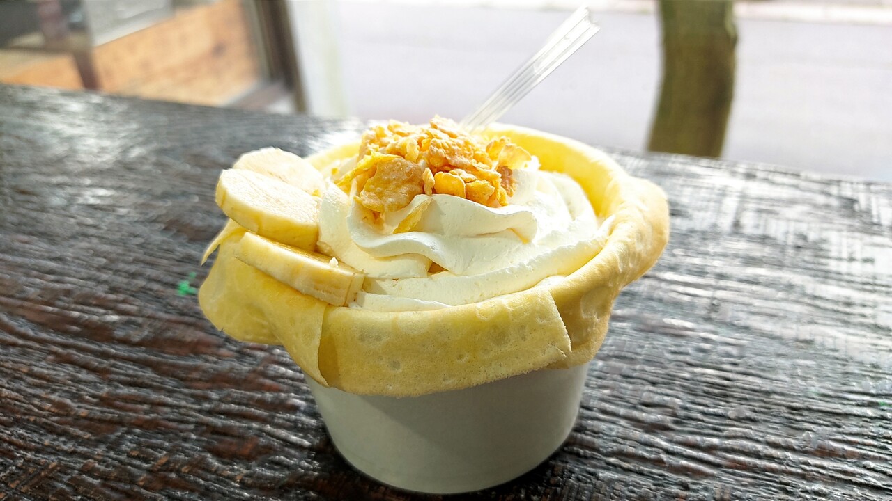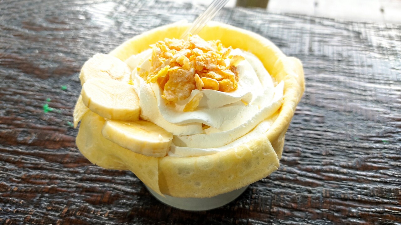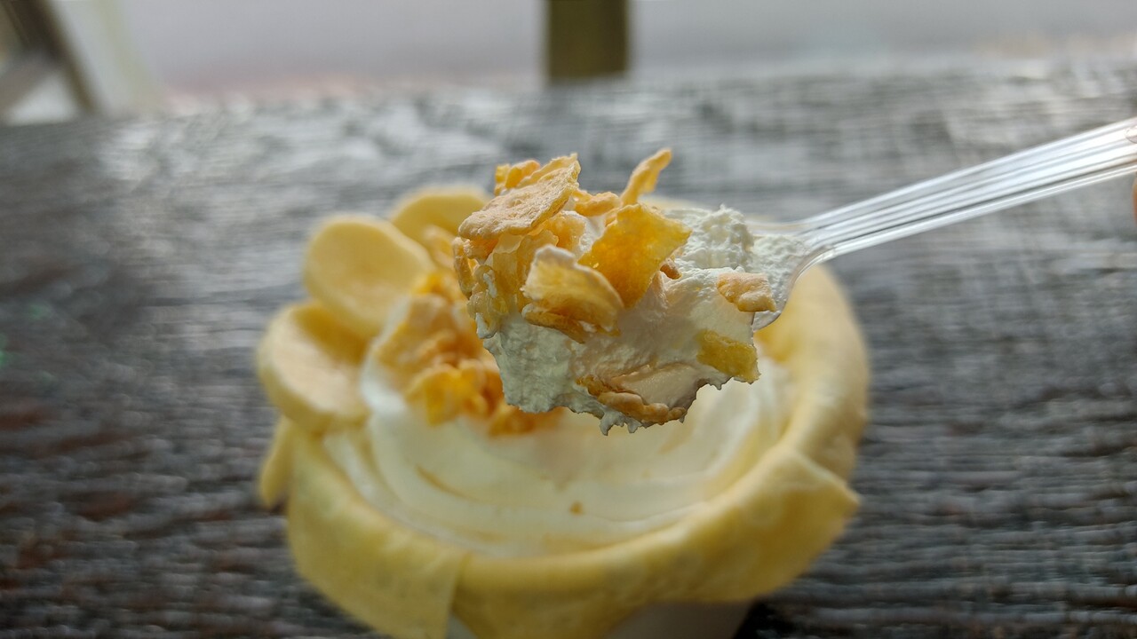 カップに沿う様にカットされたクレープが敷きつめられており その上にアイスクリーム、クリーム、シリアル、そしてバナナが添えられております