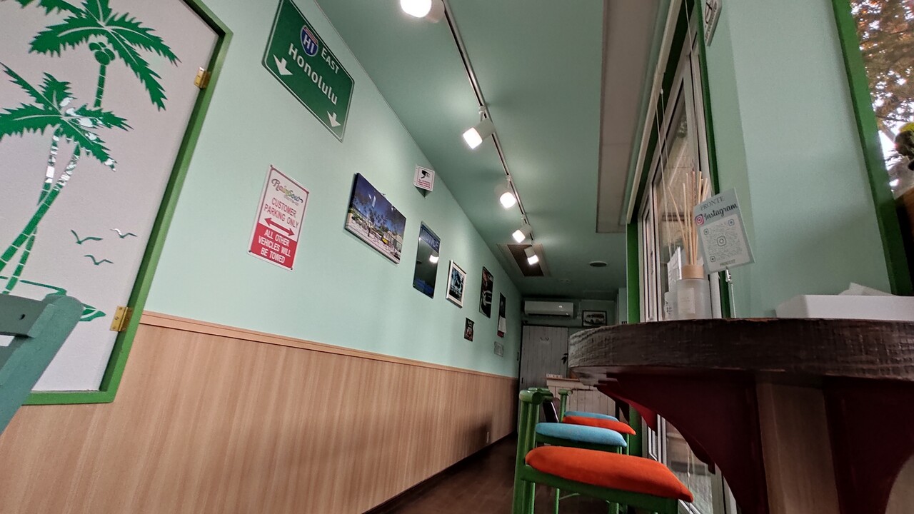 入店しますと ミントグリーンの内装とハワイを連想させるインテリアで