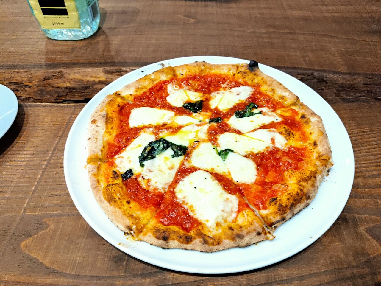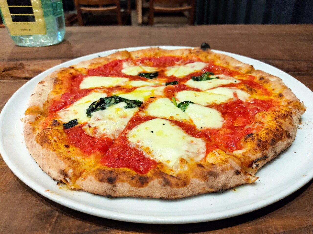 生地は薄めですが端はカリカリと香ばしくトマトソース、モッツァレラチーズ、パルメザンチーズ、バジルの内容なんですけど…