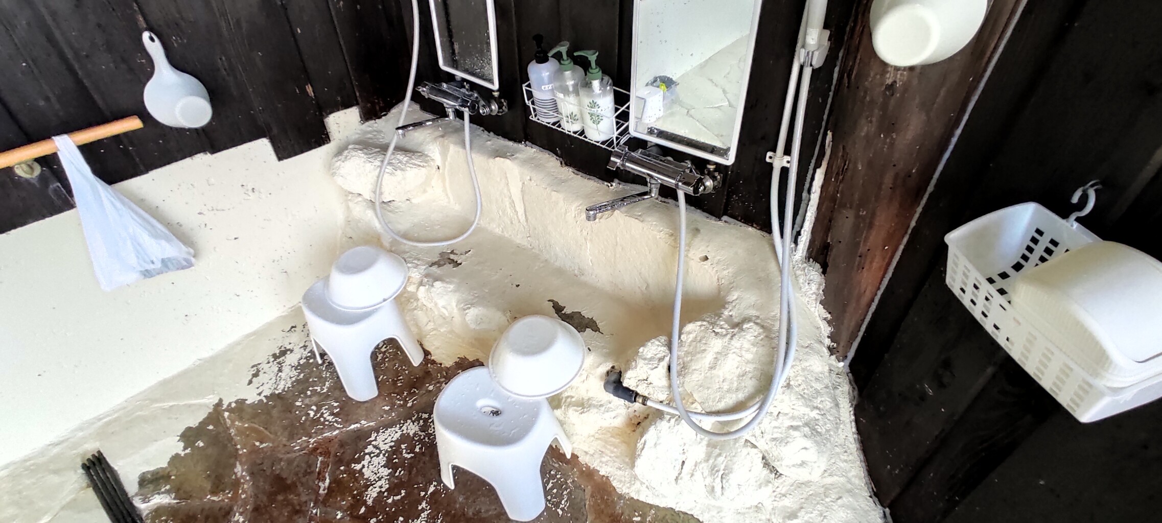洗い場は2箇所でボディシャンプー、シャンプー、ソープは備え付けられております。