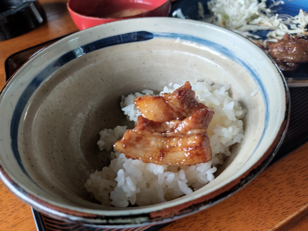 そして熱々の味噌汁を飲み 間に沢たくあんを挟み 生姜焼きをたべ進めまして程なくして完食となりました