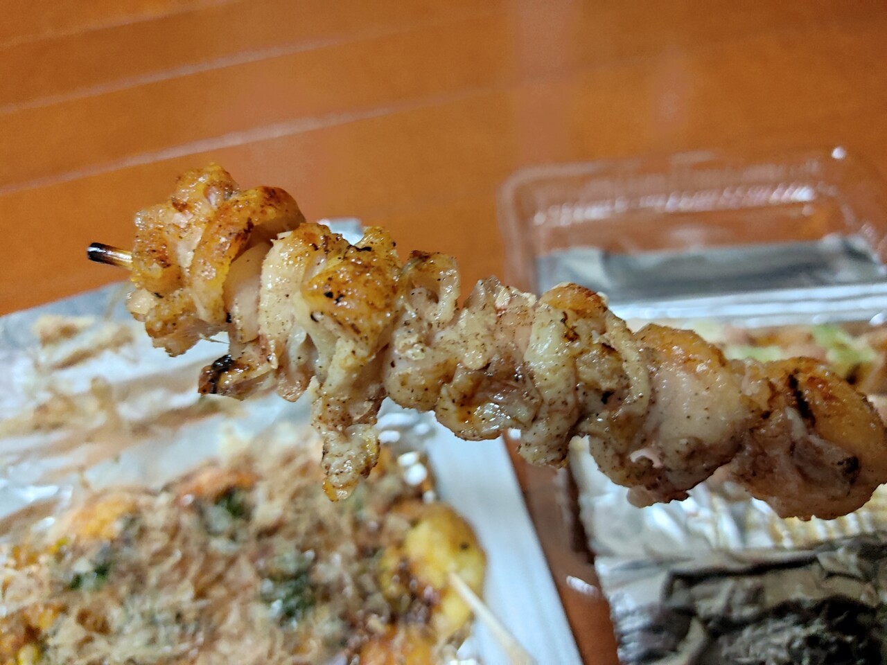 今回は 豚生肉✖️2、鷄モモ、鶏皮、砂肝 (各110円税込)とたこ焼き10個入(330円税込)を注文し 事前予約ではなかったので 駐車場で20分ほど待機します。串系は全て塩味です。