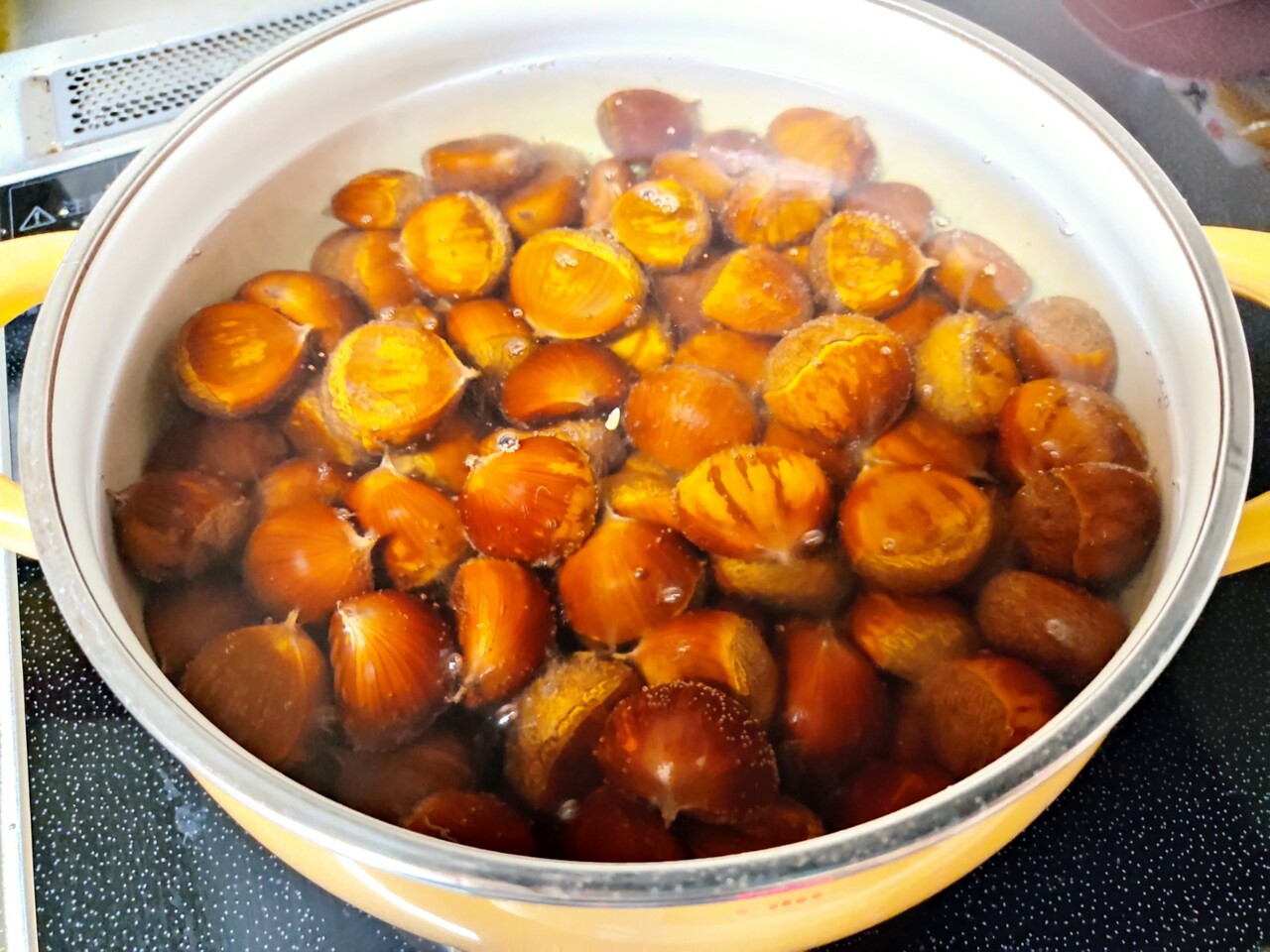 鍋に栗1kgと水1kgを投入して 塩適量を投入します