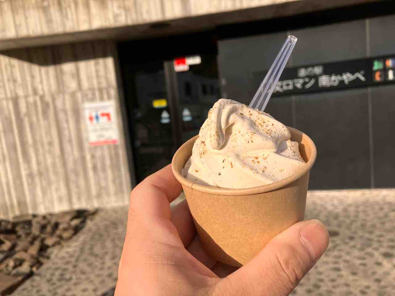 ソフトクリームも少しだけ茶色がかっていて 上に掛かっているものは胡桃パウダー