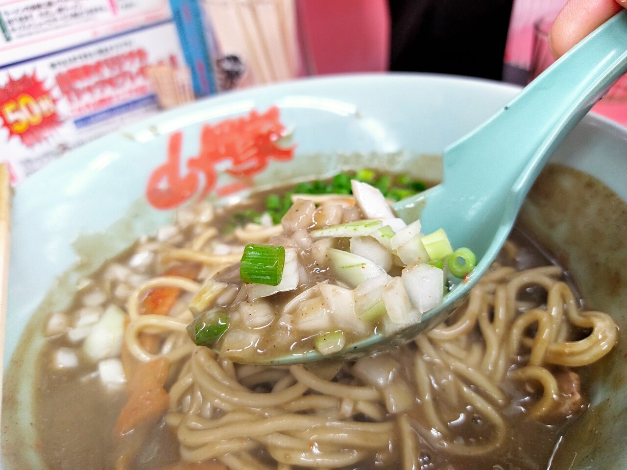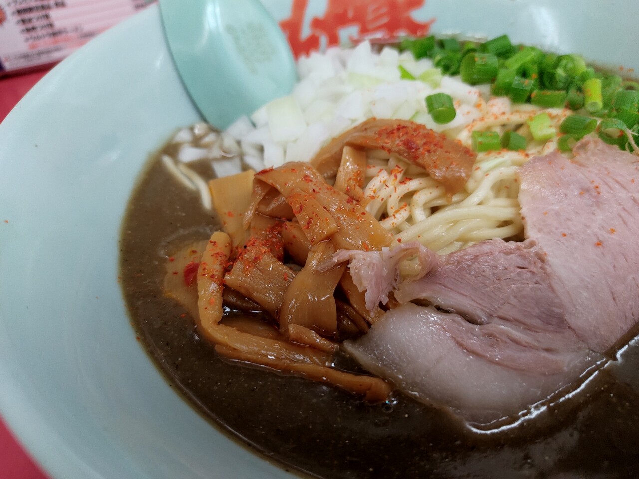 刻み青ネギ、玉ねぎは シャキシャキの食感で ドロドロとした豚骨煮干しスープのアクセントとしては最高ですね