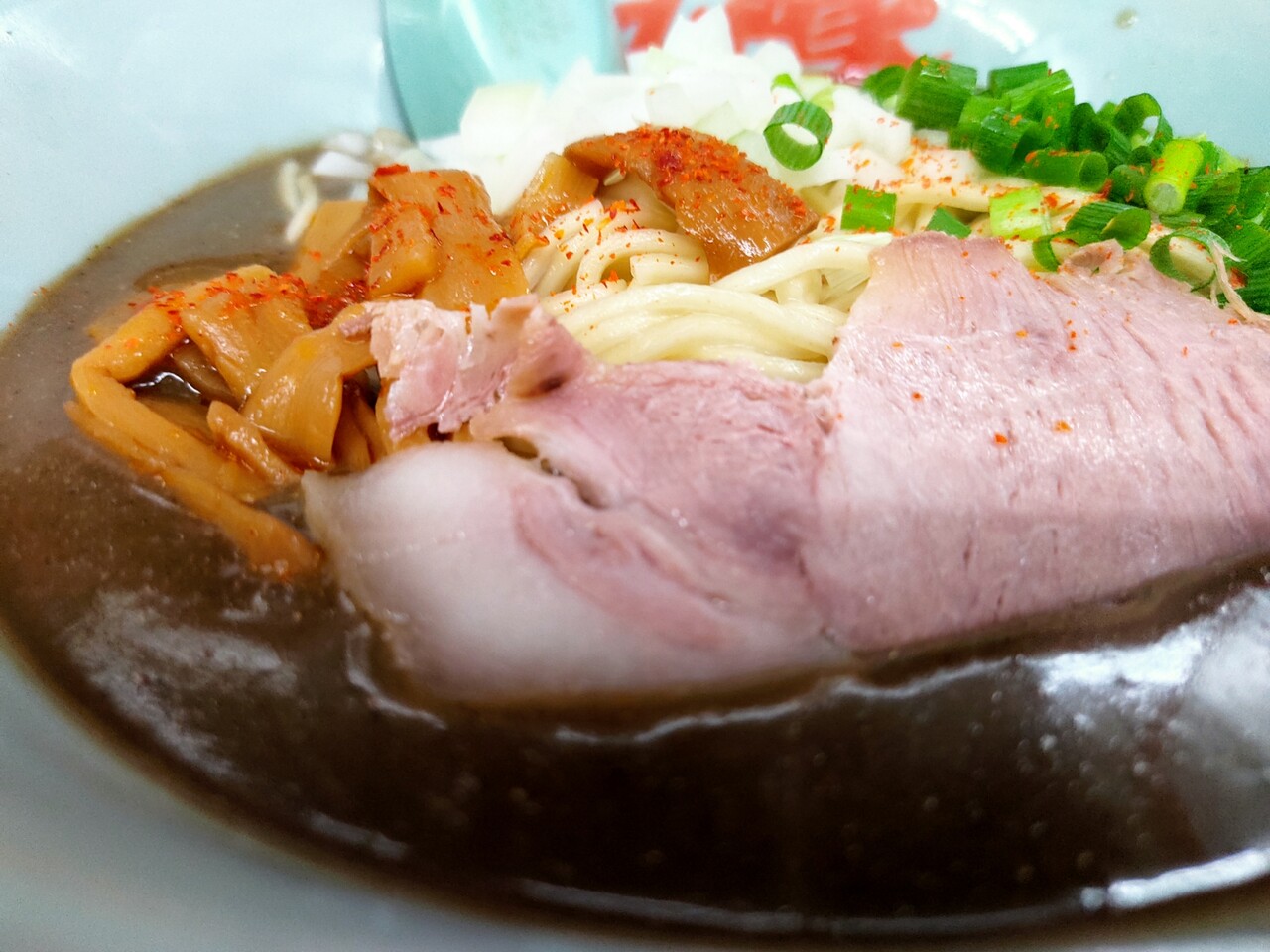 鬼煮干しスープの上には メンマ、刻み玉ねぎ、長ネギ、チャーシューが乗っております