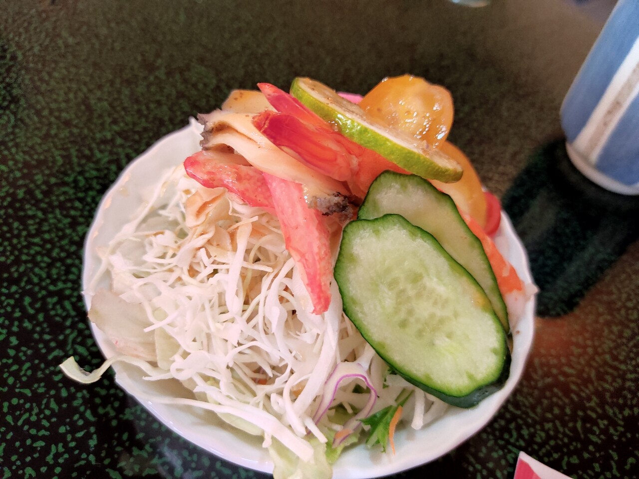 続いて 海鮮サラダ… 海老蟹鮑の乗った海鮮サラダは豪華なんです