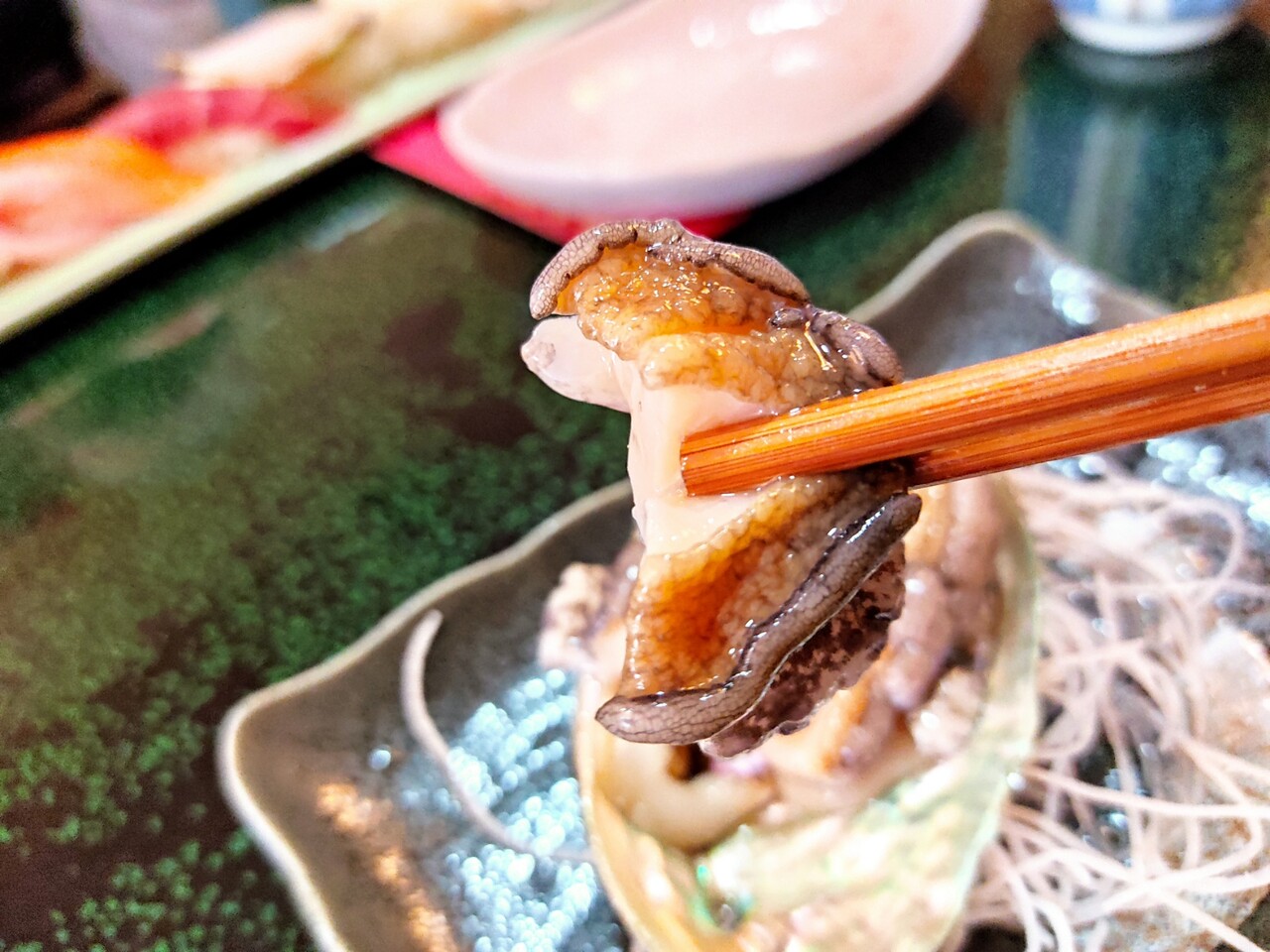 お寿司を食べすすめていると 鮑踊り焼きの火が消えていたので 殻から引っ剥がして 大きな鮑を頂きます…