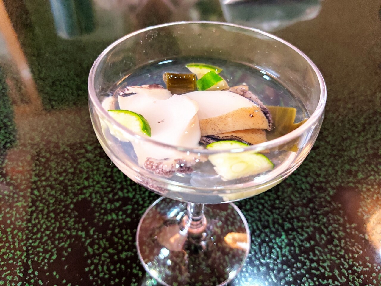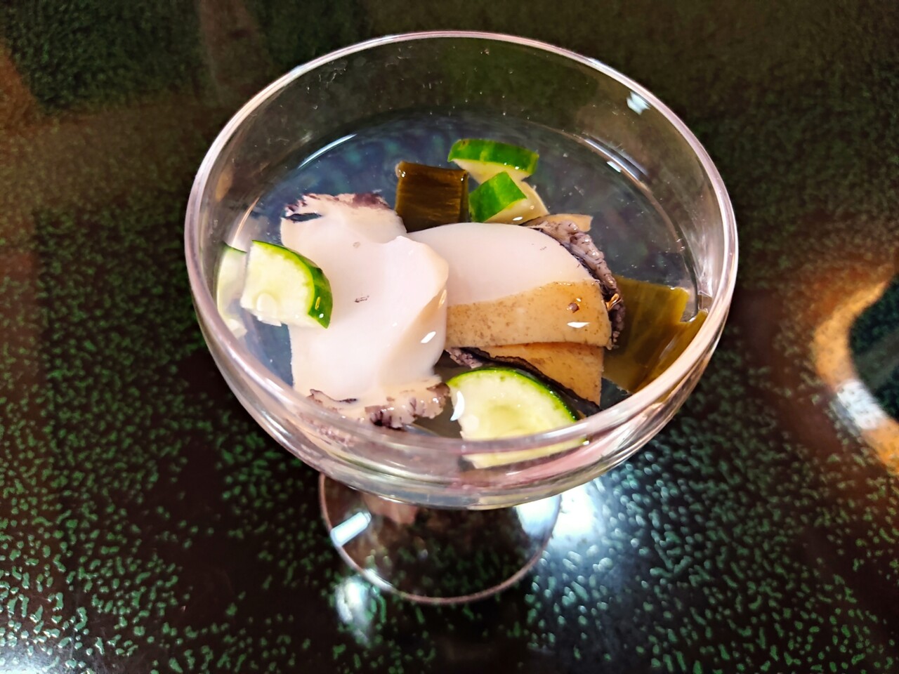 塩水に出汁用の昆布が入っており ぷかぷかと浮かぶ鮑ときゅうり