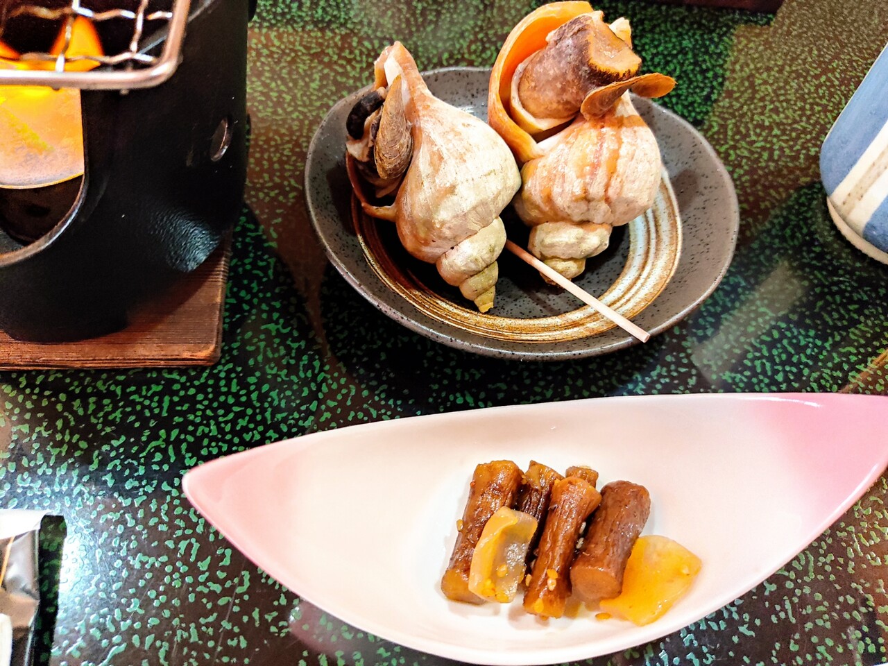 着火され 炙られて踊る鮑を眺めながら 他のものも頂いていきましょう