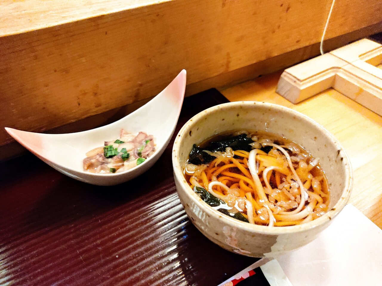 何となくお店の方と雑談しながら待っていると… 温かいうどん?と小鉢が目の前にやってきました