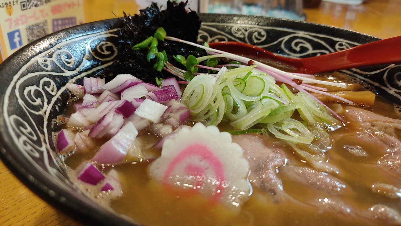 ばら海苔、玉ねぎの微塵切り、長ネギ、三つ葉、なると、チャーシュー、めんまの内容となります