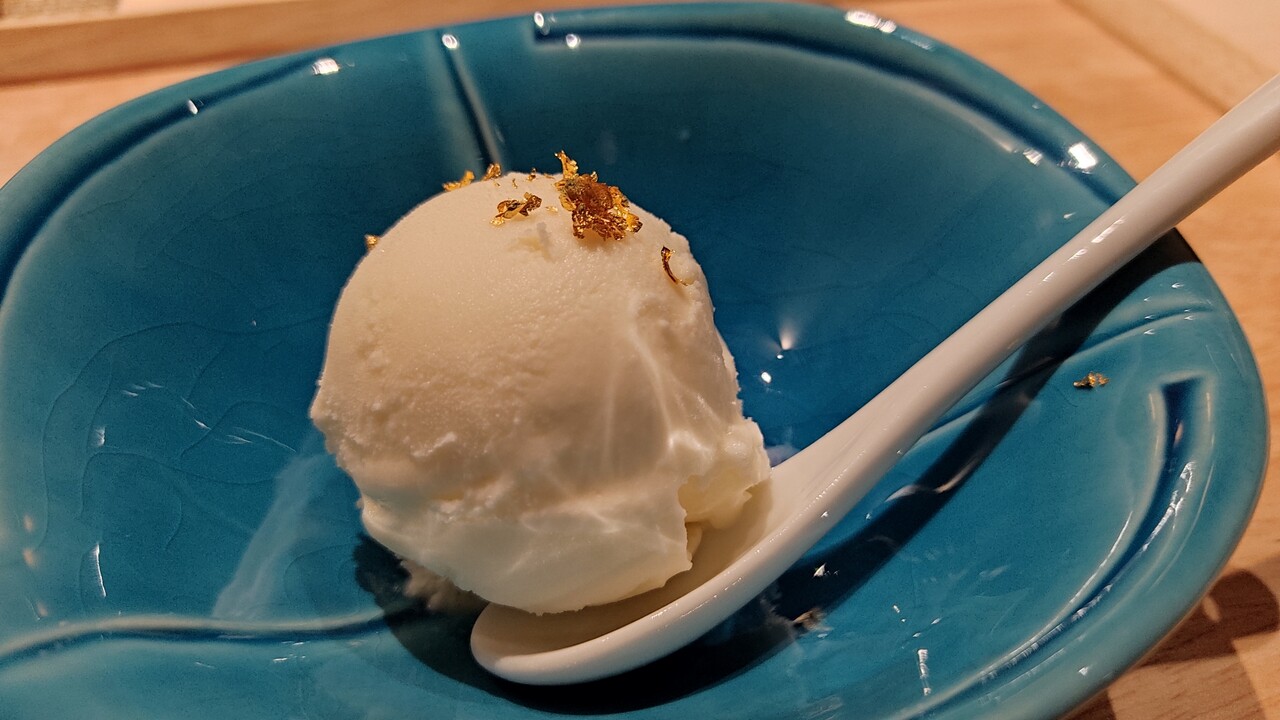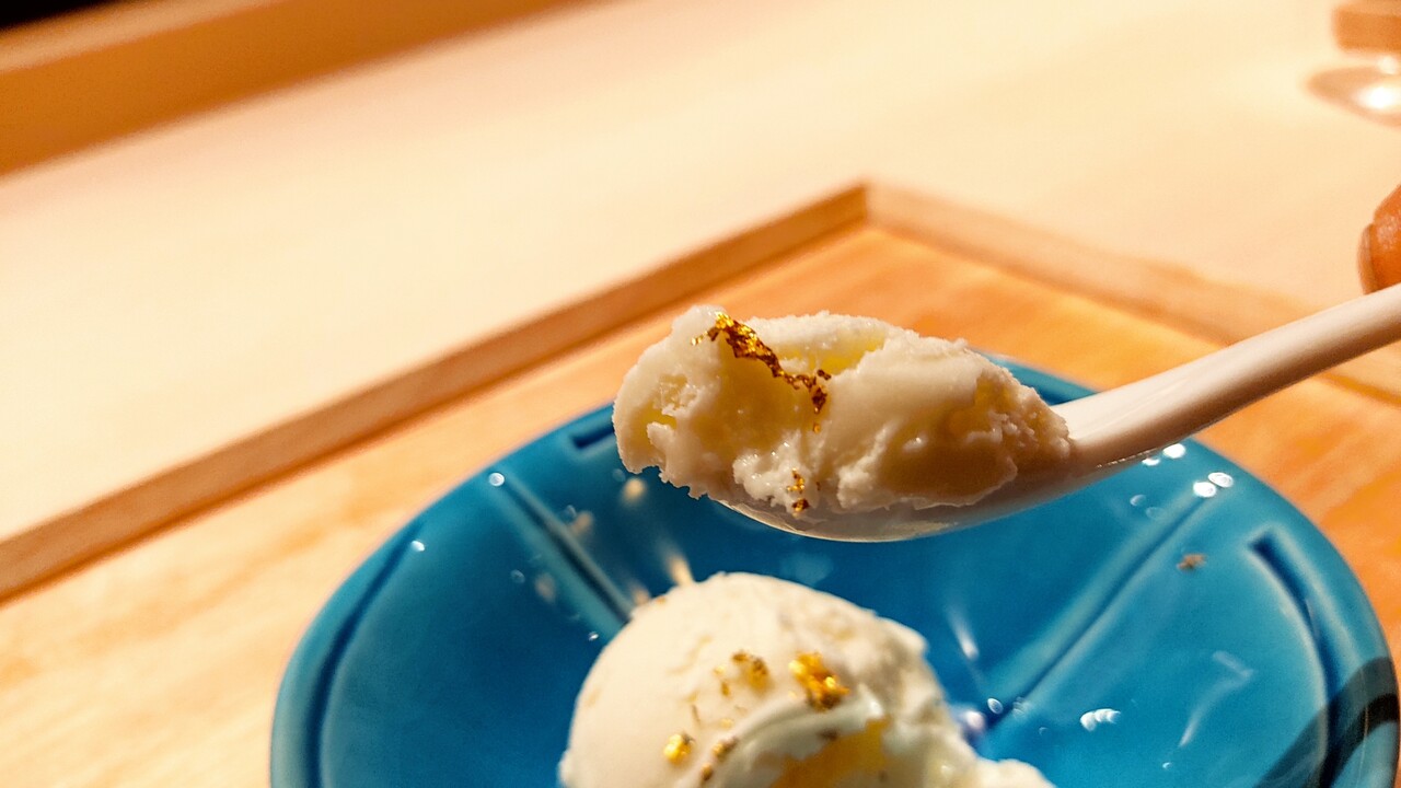 スプーンでアイスと金箔を掬って食べると…